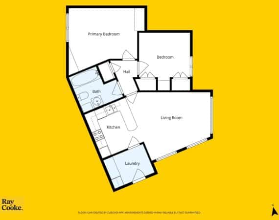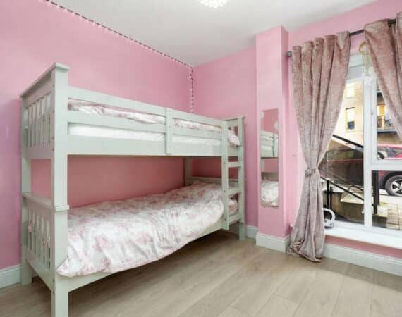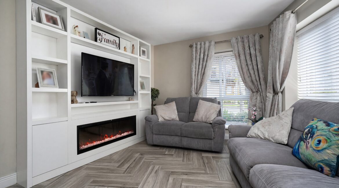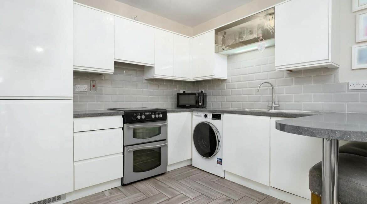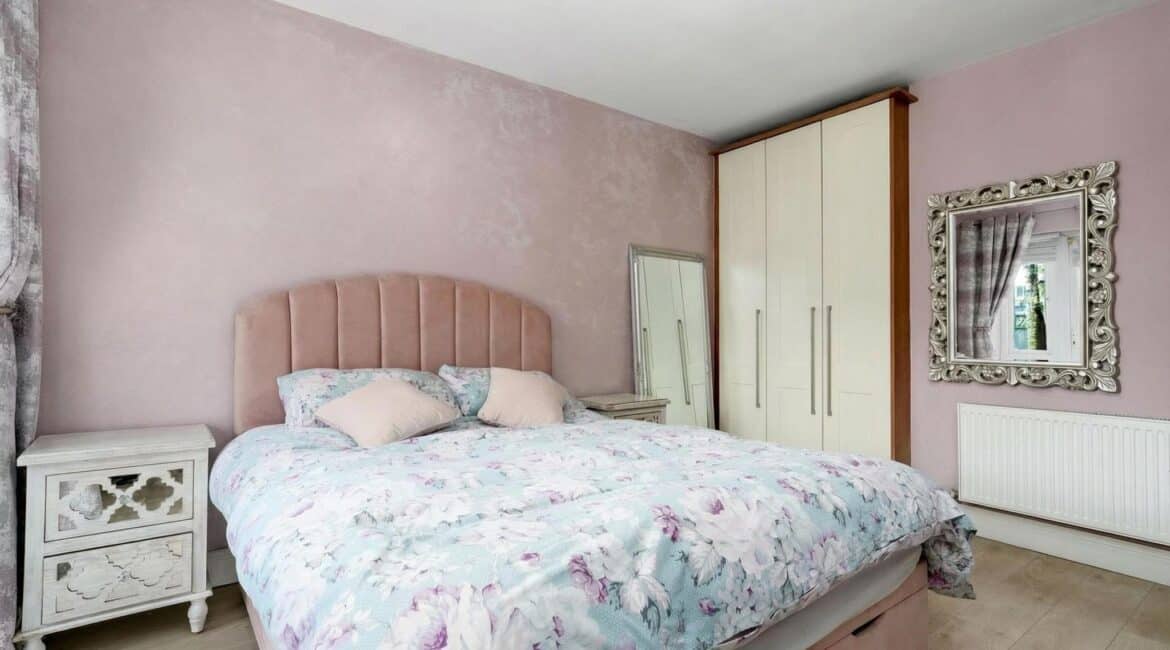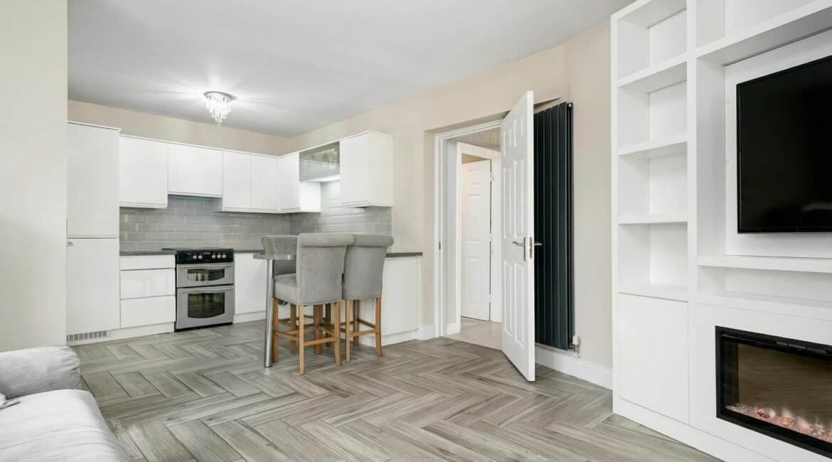 Extending to c.64 sq.m, the accommodation comprises an entrance hallway, which also functions as a practical utility/laundry space, leading through to a bright and spacious open plan living and dining area. The modern fitted kitchen is finished to a high standard and features a breakfast bar. There are two generous double bedrooms, both with ample storage, along with a fully tiled modern family bathroom.
