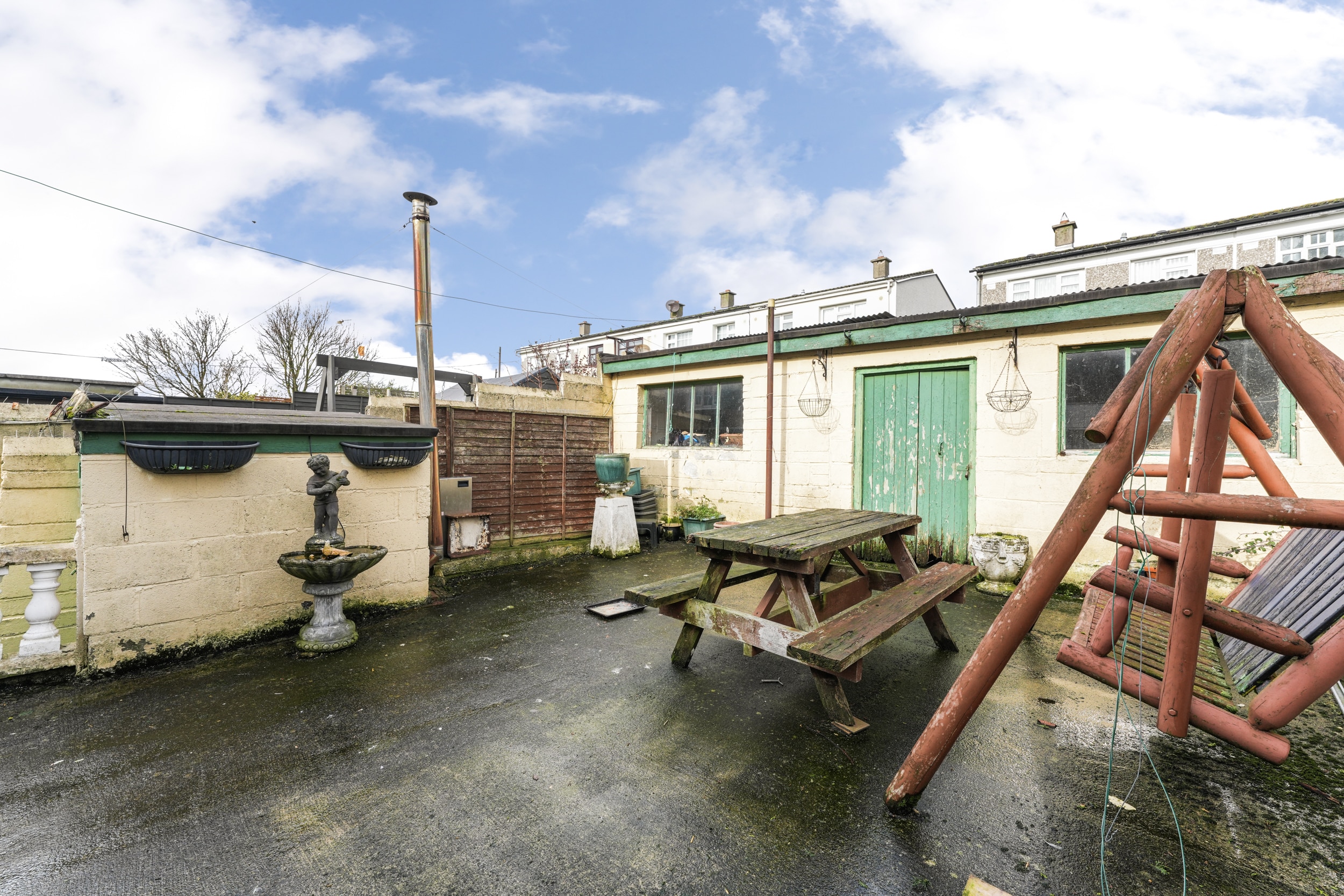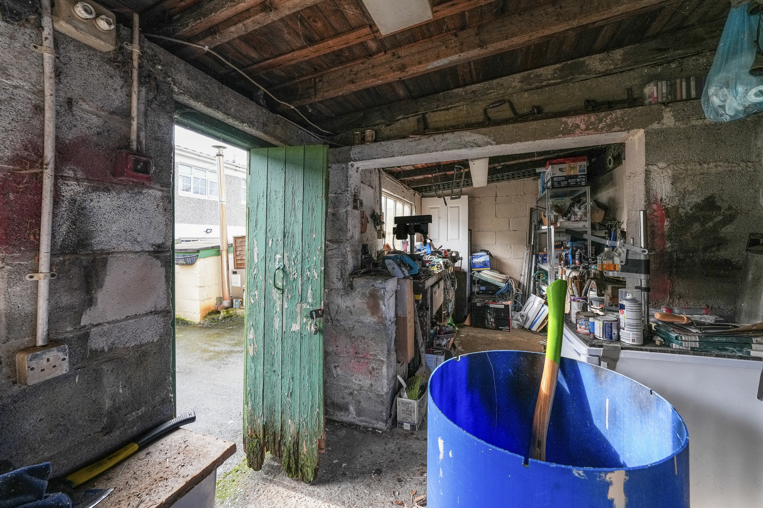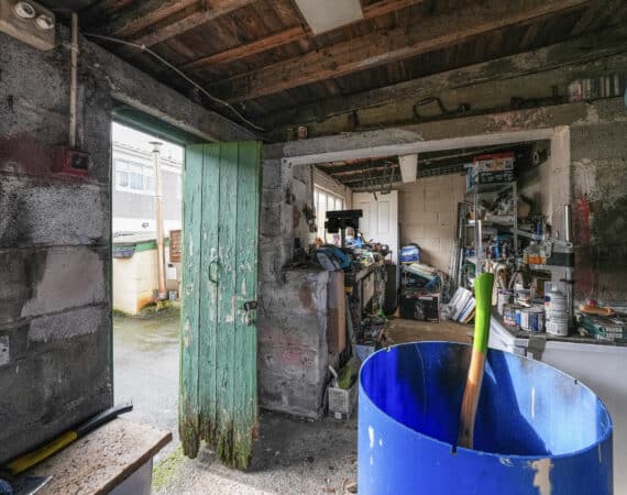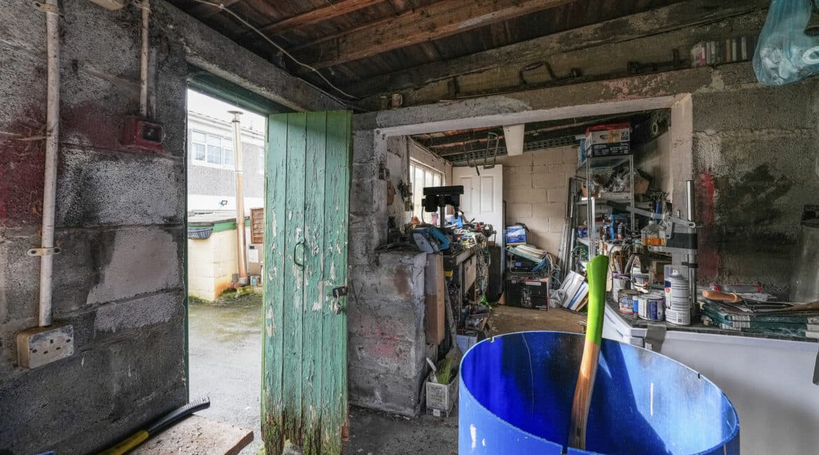 A standout feature of the garden is the large garage, complete with electricity, making it perfect for storage, a workshop, or for anyone looking to use equipment or tools. There is also the added benefit of side access and a lean-to structure located to the side of the house, offering further storage or utility space.