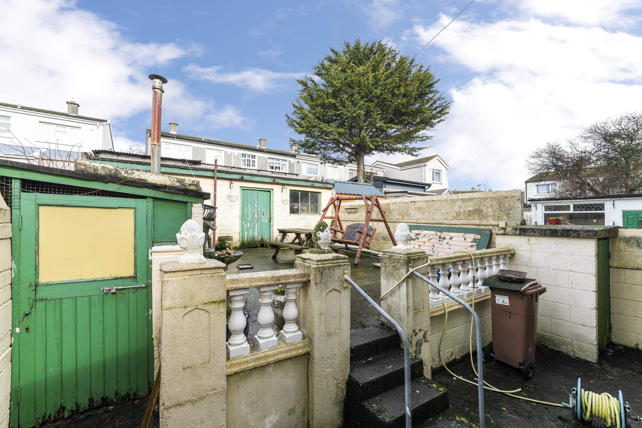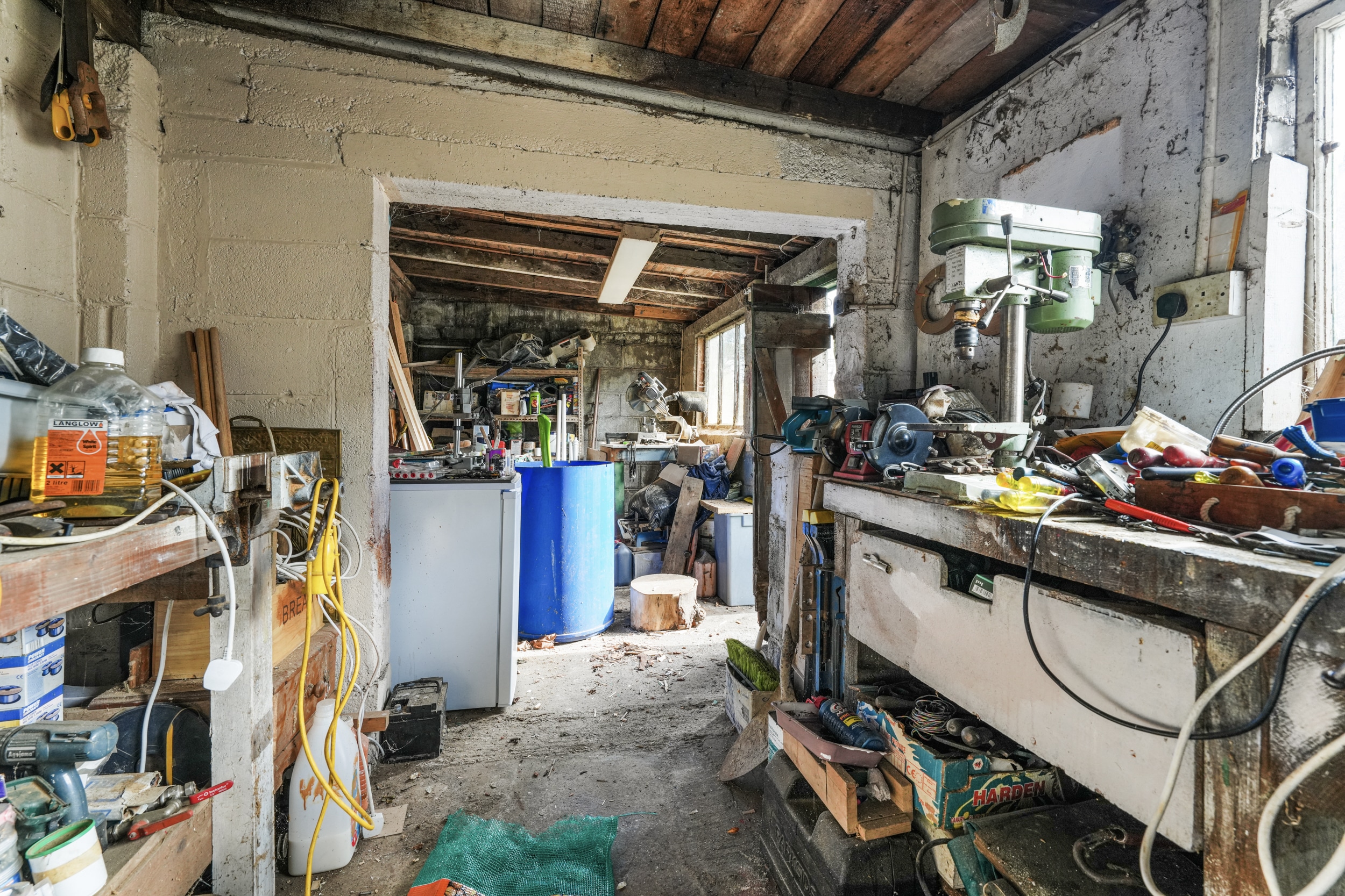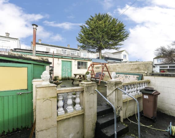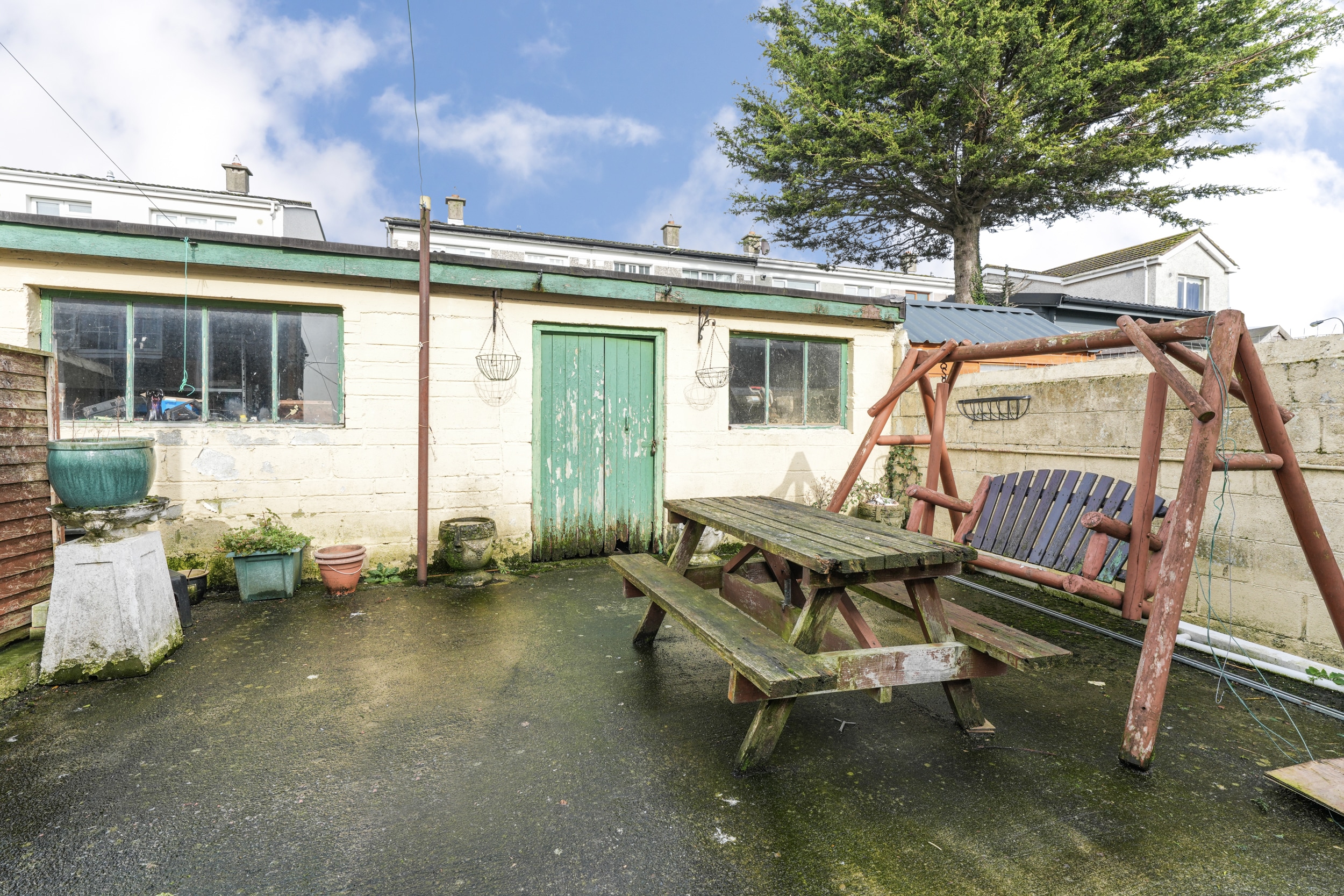 A standout feature of the garden is the large garage, complete with electricity, making it perfect for storage, a workshop, or for anyone looking to use equipment or tools. There is also the added benefit of side access and a lean-to structure located to the side of the house, offering further storage or utility space.