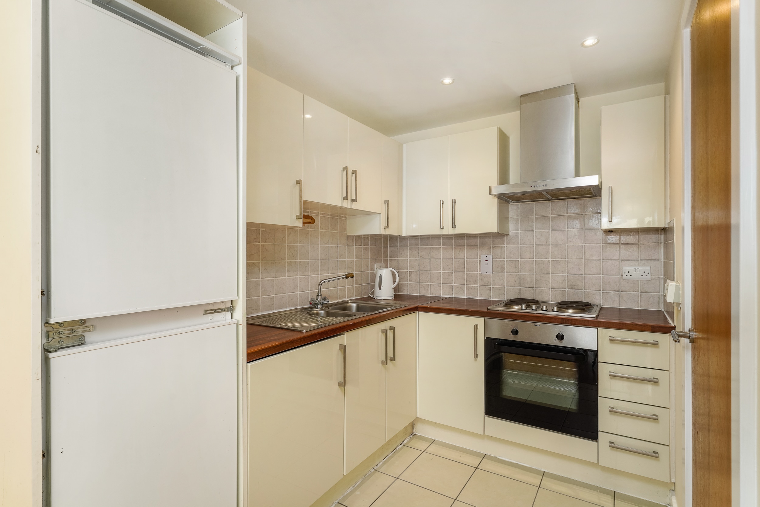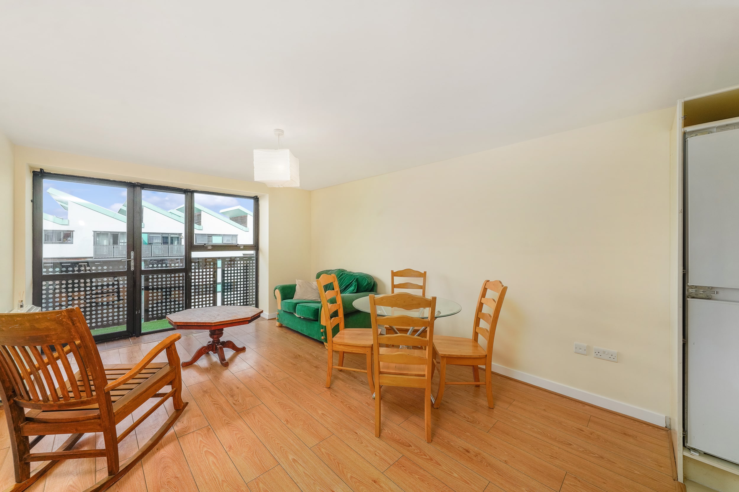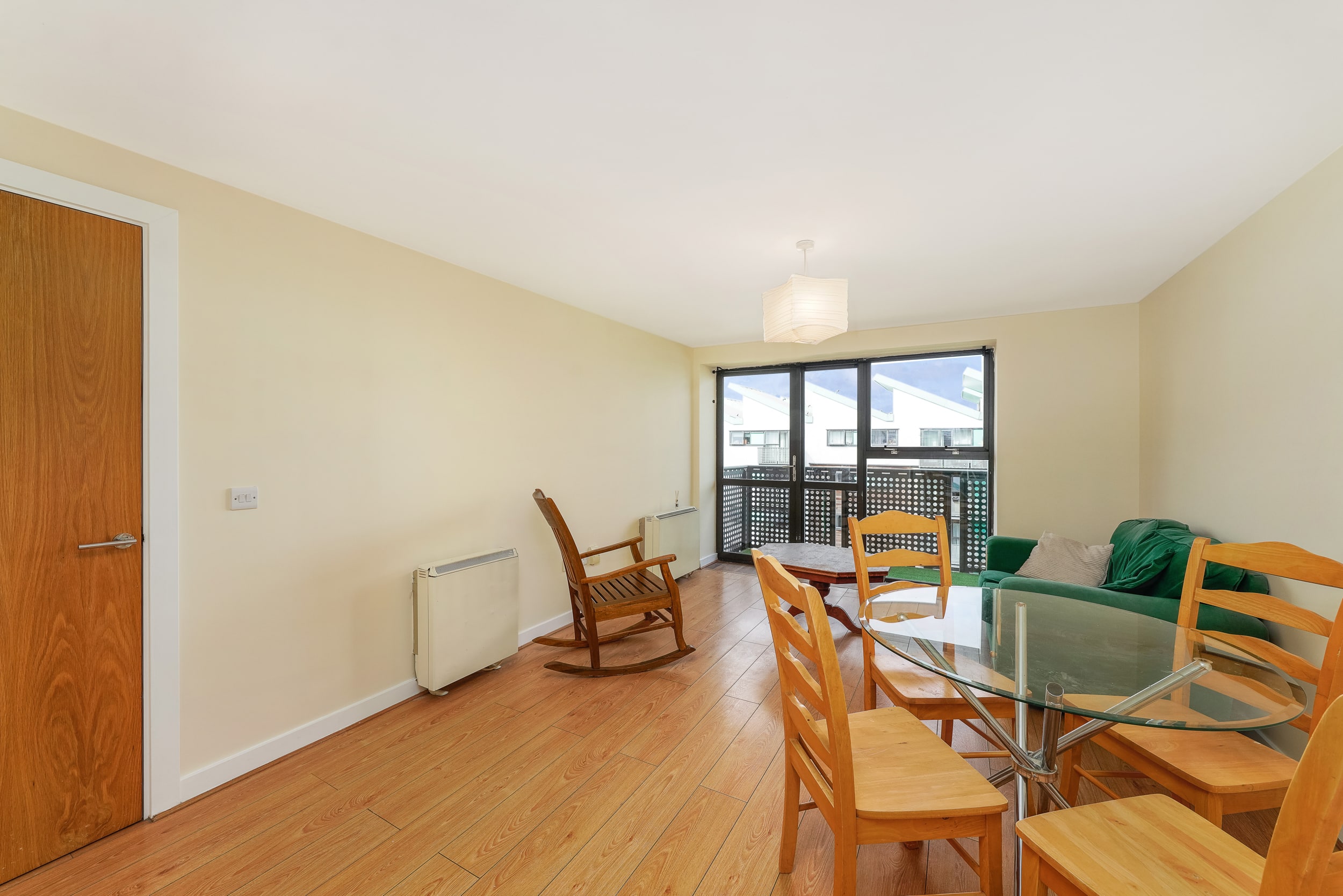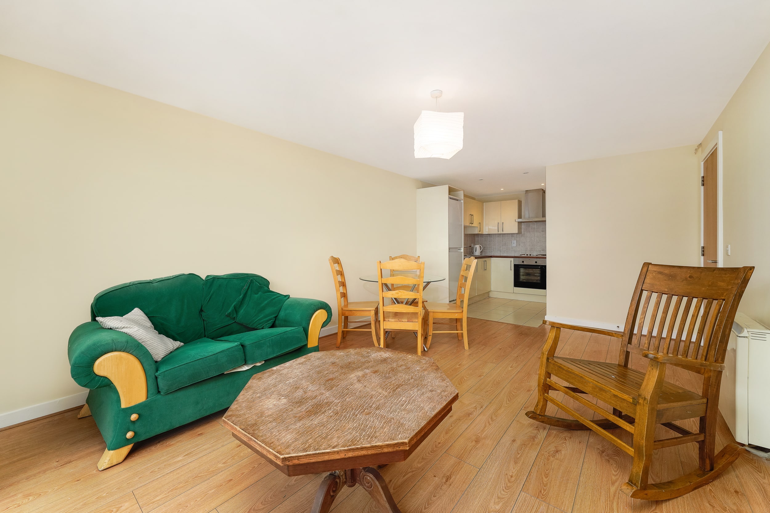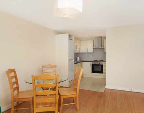 This stylish one-bedroom, one-bathroom top-floor apartment boasts a bright, well-proportioned layout. A welcoming entrance hallway leads to a generous living area that opens onto a private balcony—perfect for unwinding or hosting friends. The open-plan design seamlessly combines the kitchen, dining, and living spaces, creating a warm and inviting atmosphere. The generously sized double bedroom includes built-in wardrobe space, offering ample storage. The bathroom is fitted with a bath and overhead shower, along with a toilet and hand basin.