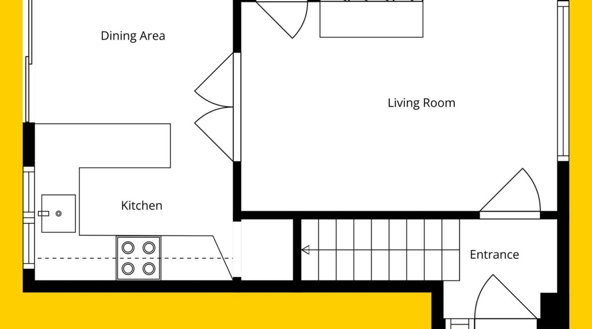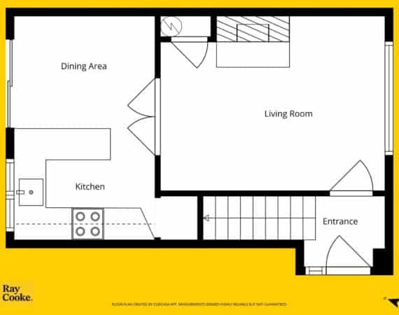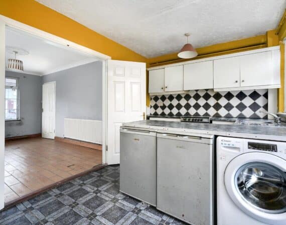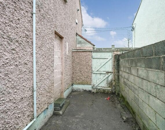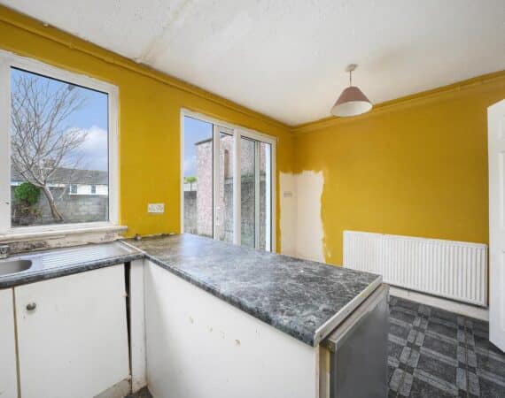 Accommodation extends to approximately 60 sq.m and is well laid out throughout. The ground floor comprises a porch entrance, leading into a bright and welcoming living room, with double doors opening through to a kitchen/dining area overlooking the rear garden. Upstairs hosts two generously sized double bedrooms, both featuring built-in wardrobes, along with a family bathroom.