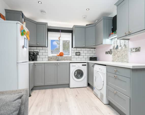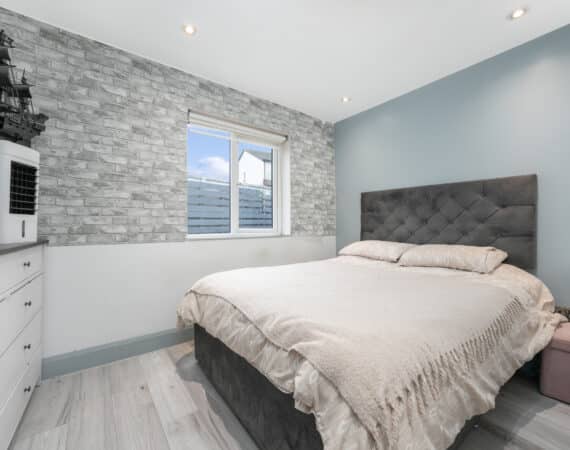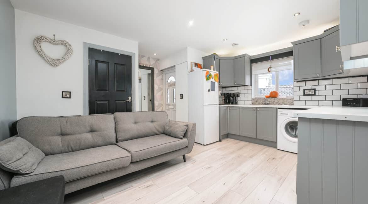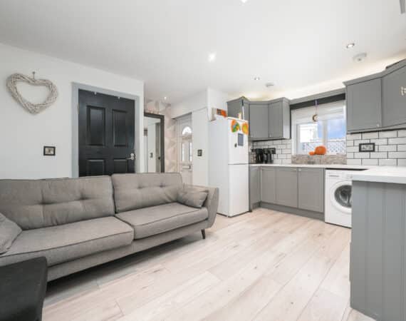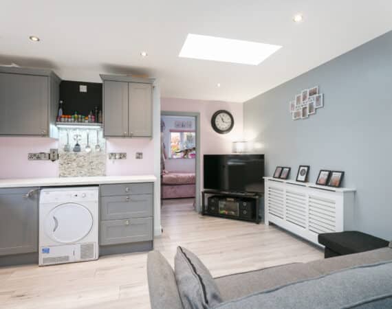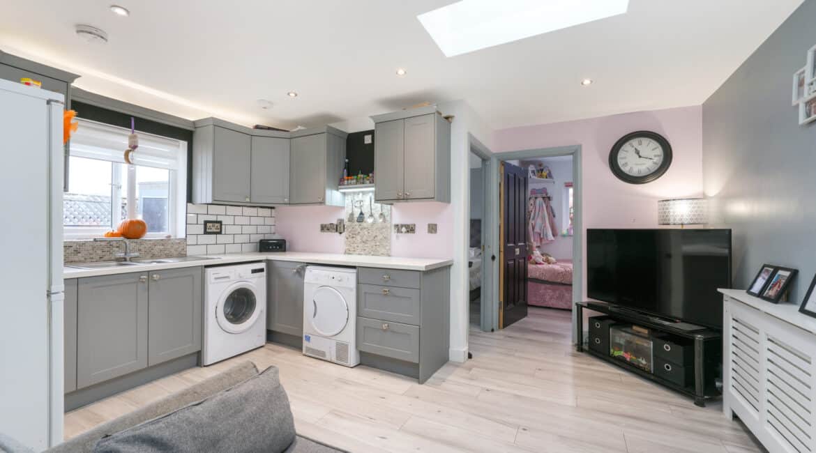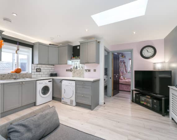 This modern two-bedroom granny flat extension features an open-plan kitchen, dining, and living area, a contemporary family bathroom, and quality finishes throughout—ideal for generating extra rental income or accommodating family guests.