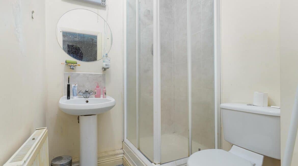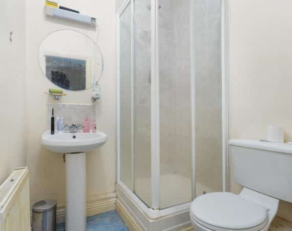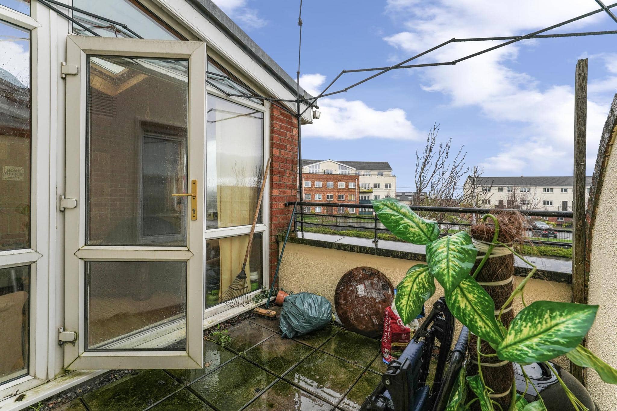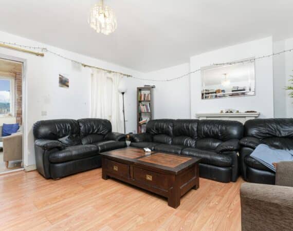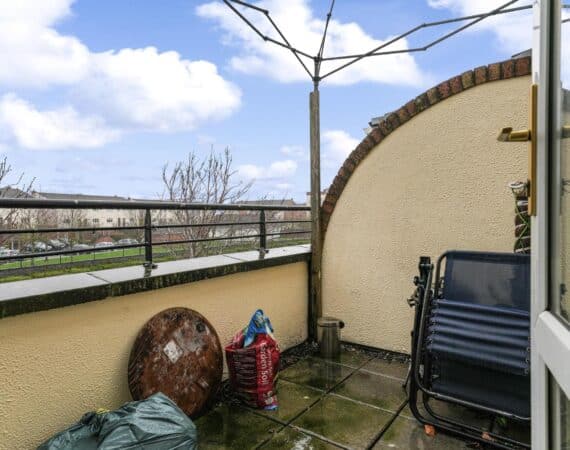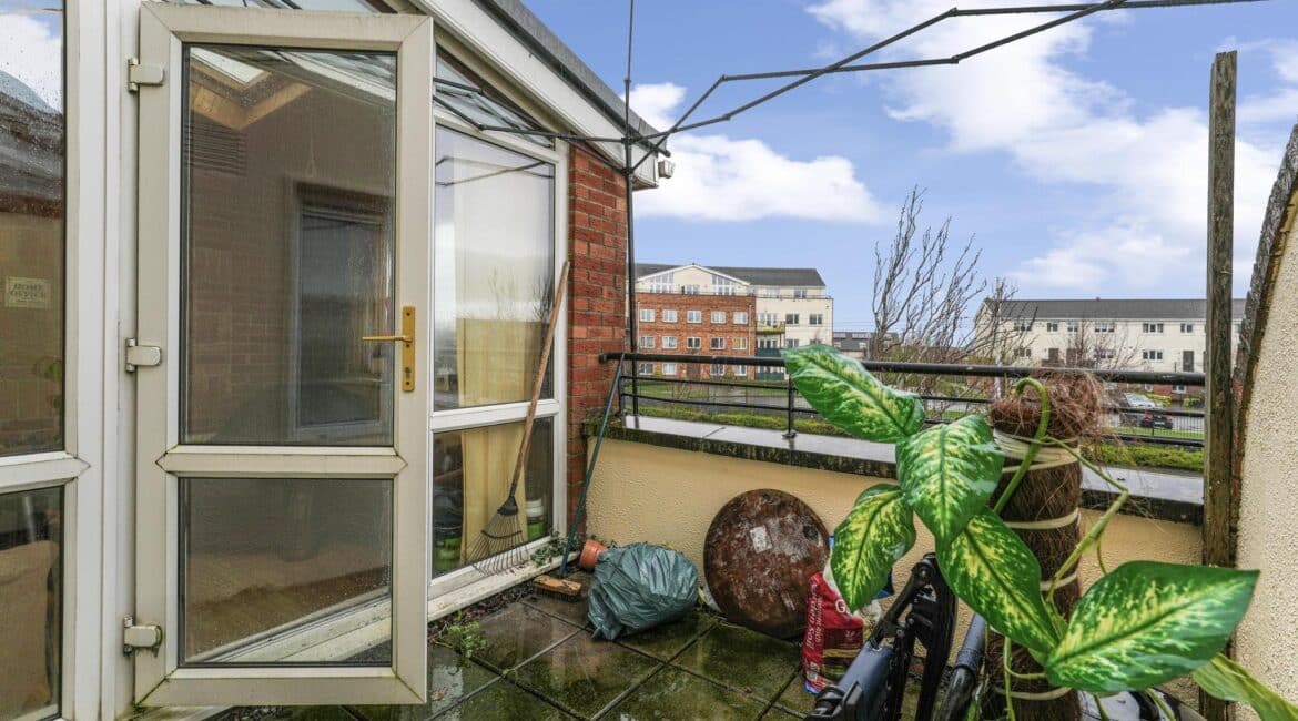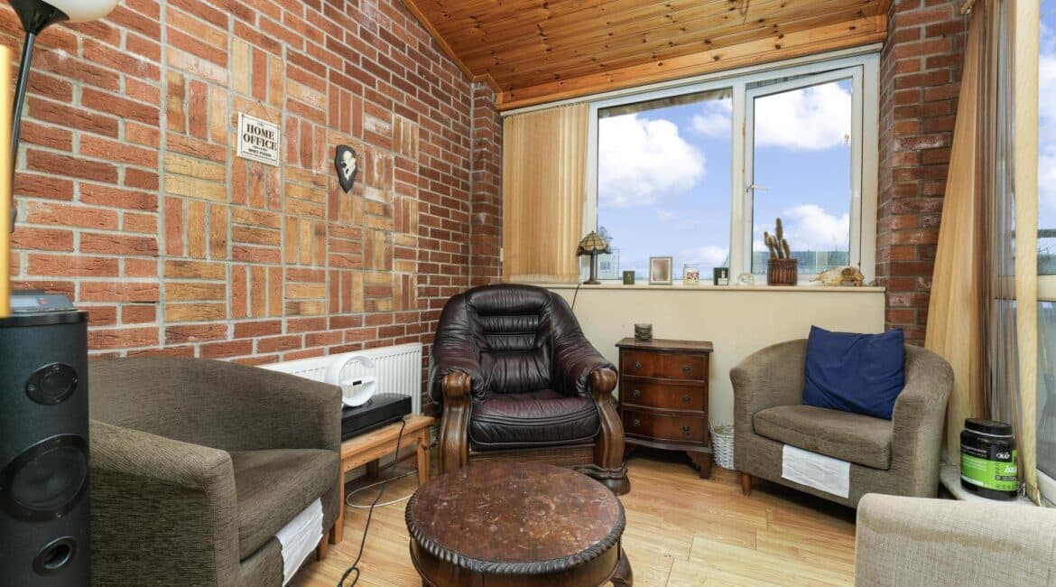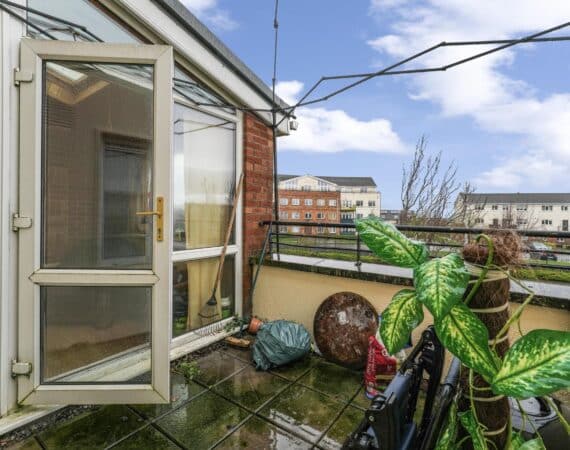 On the ground floor, the property features a bright and functional kitchen space, downstairs toilet & large living area leading out to a sunroom and private balcony area, adding valuable outdoor space.