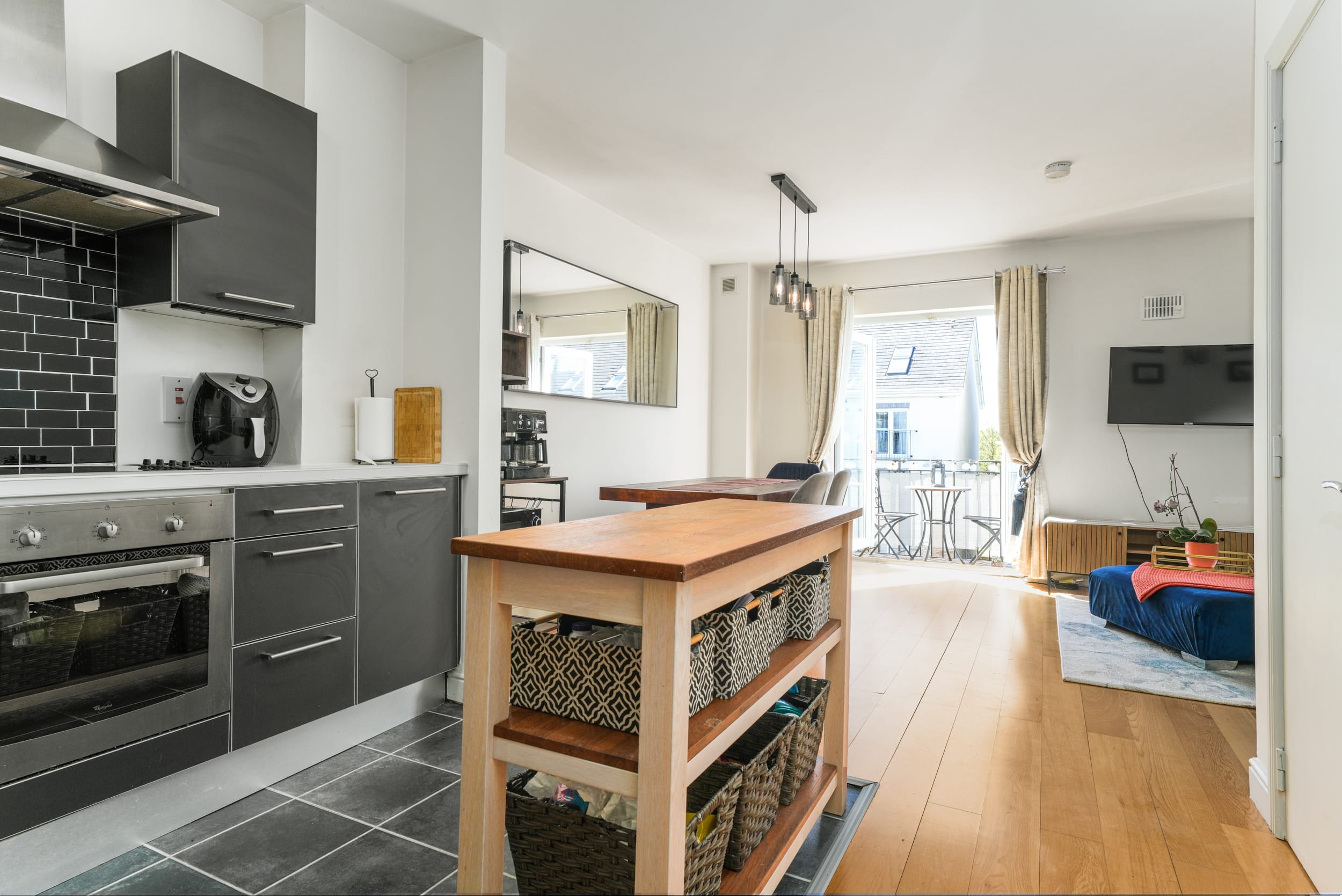 The first floor briefly comprises a welcoming entrance hallway, family bathroom, a spacious double bedroom complete with built-in wardrobes, and a large open-plan kitchen/dining/living area to the front of the property. Double doors from the living room open onto a superb south-facing private balcony, perfect for outdoor dining, relaxing, or entertaining guests.