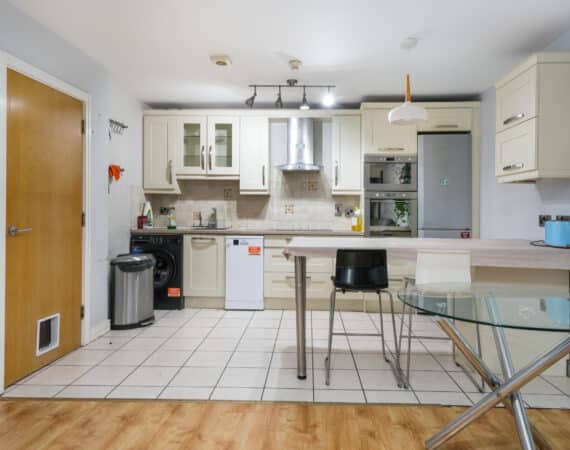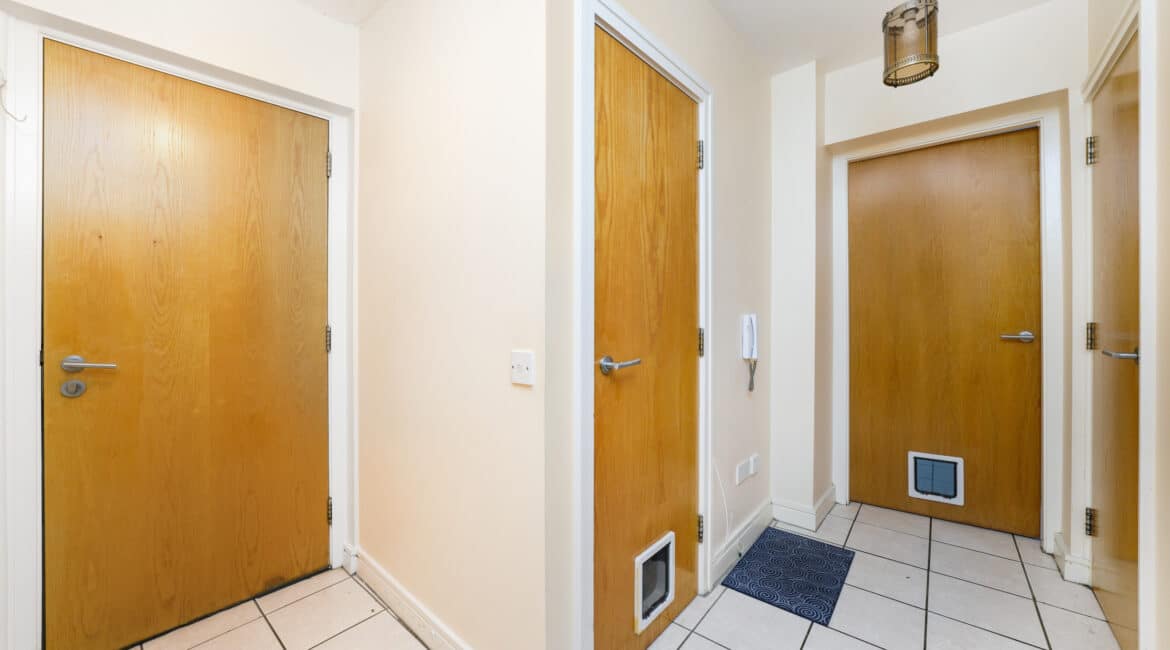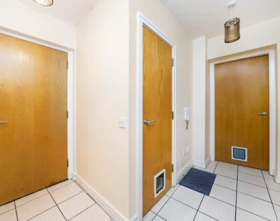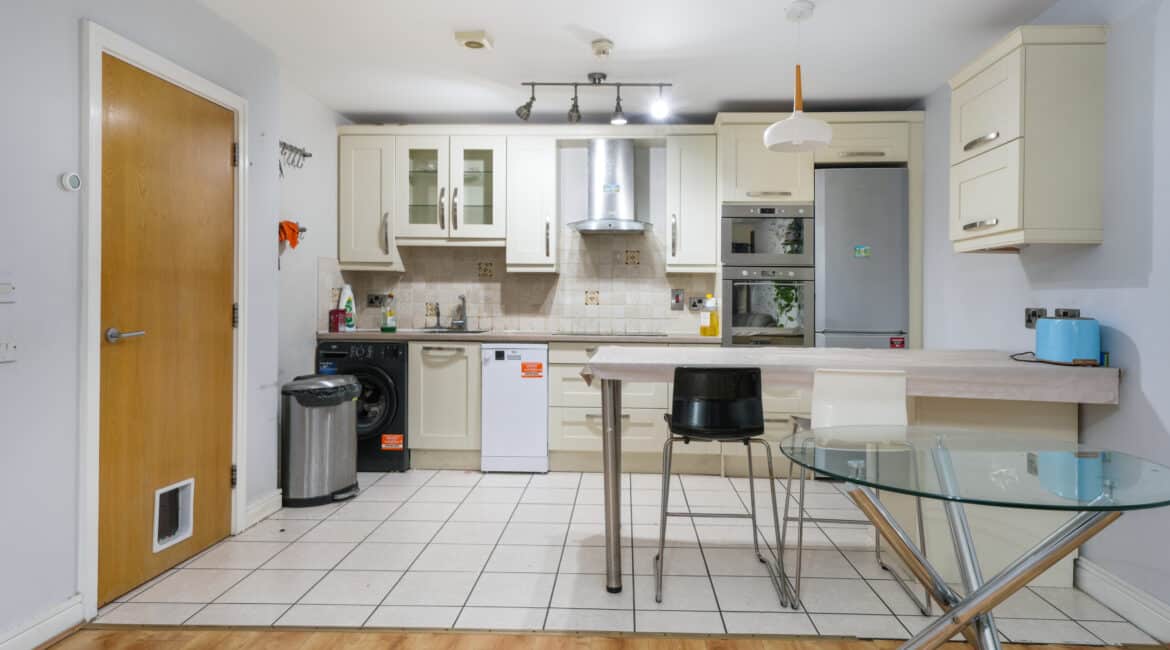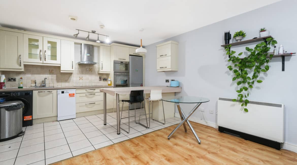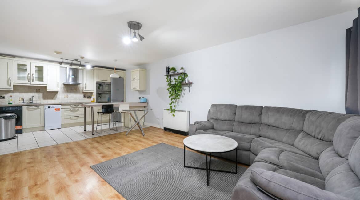 A large storage area adds practicality to the layout. The hallway leads to a beautifully designed open-plan living and dining area featuring a fully fitted modern kitchen and access to a private south-facing balcony that enjoys excellent privacy and does not overlook neighbouring properties.