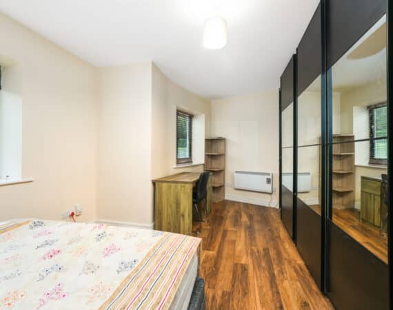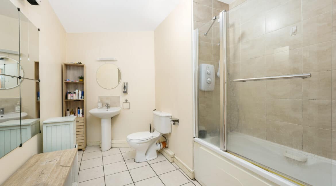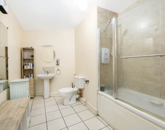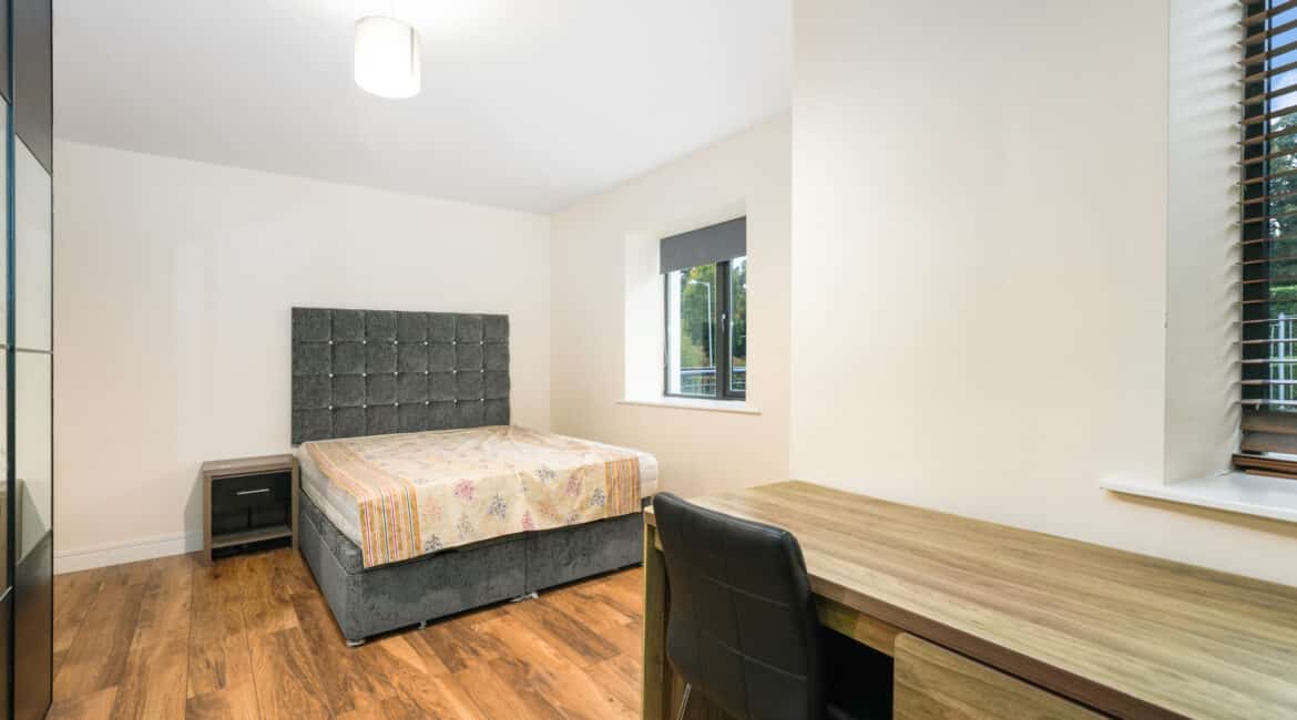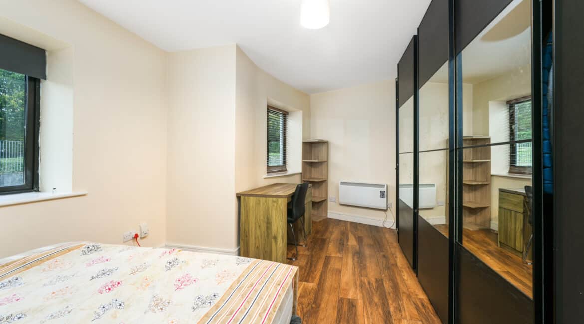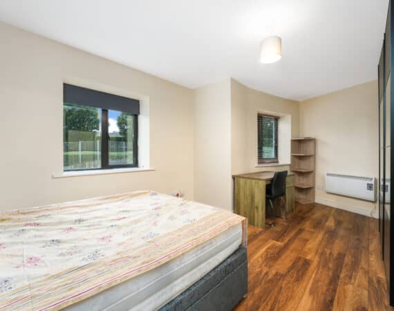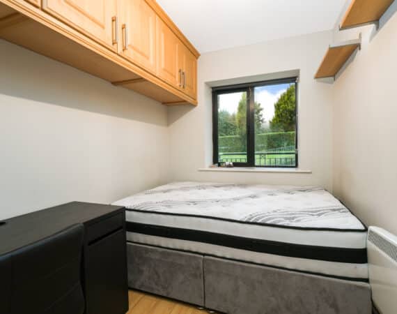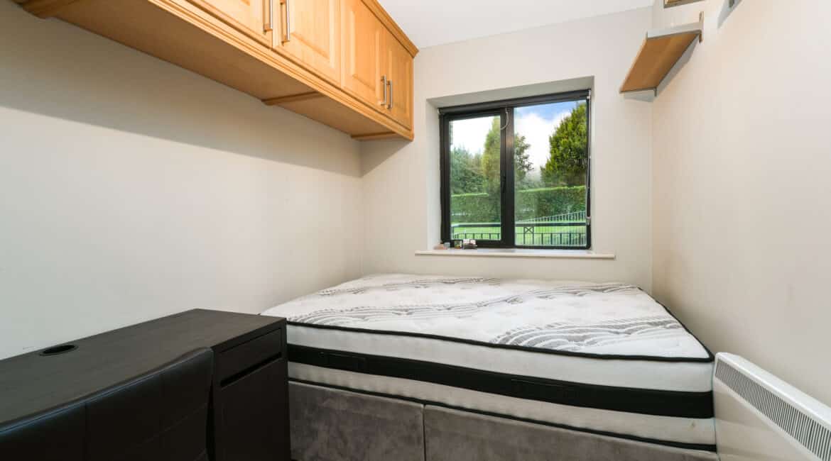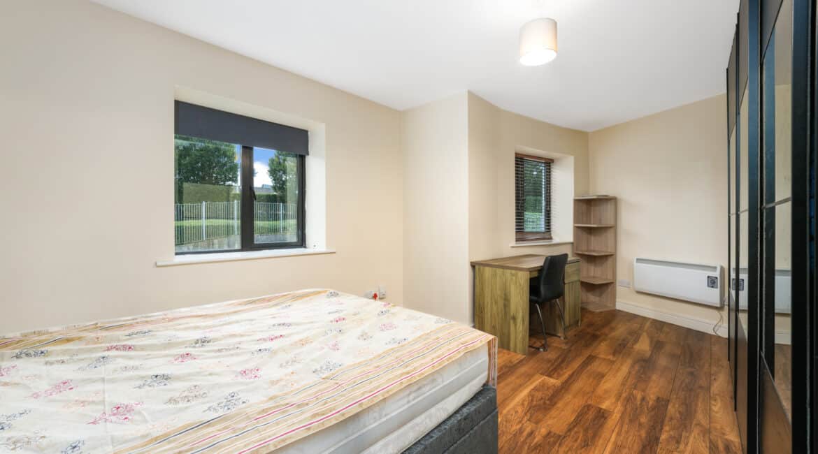 Upon entering, you are welcomed into a bright hallway providing access to all rooms. The master bedroom is a generous double with fully fitted wardrobes, while the second bedroom—located adjacent—is also well-proportioned. There is a spacious bathroom fitted with a toilet, hand basin, bath, and stand-up shower.
