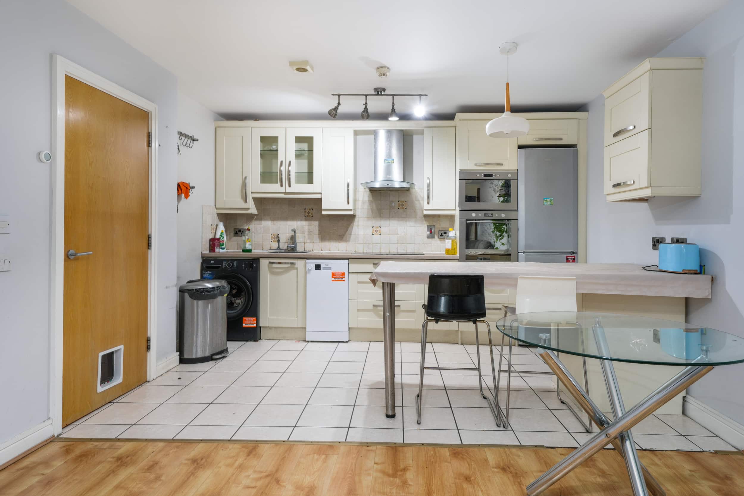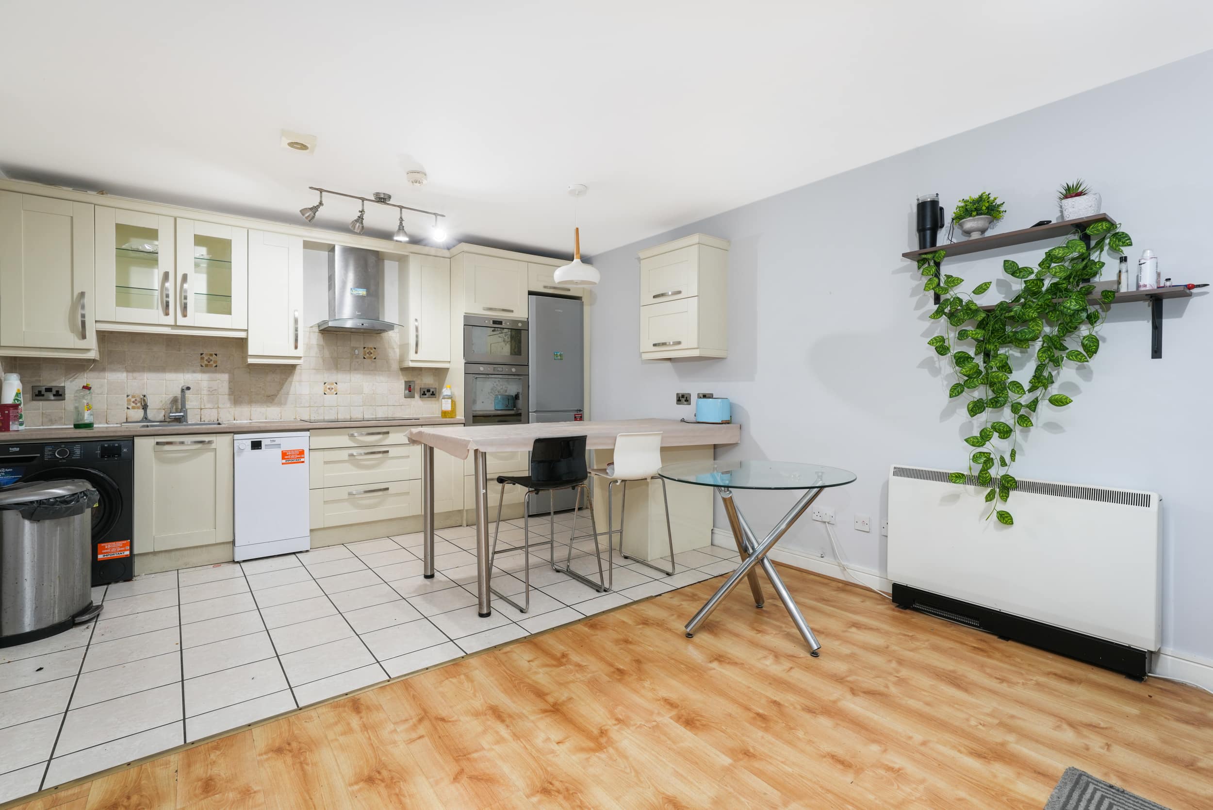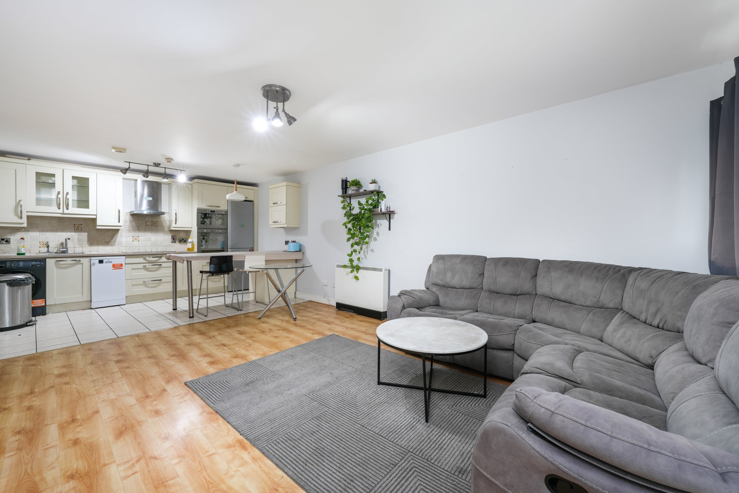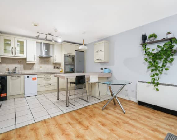 A large storage area adds practicality to the layout. The hallway leads to a beautifully designed open-plan living and dining area featuring a fully fitted modern kitchen and access to a private south-facing balcony that enjoys excellent privacy and does not overlook neighbouring properties.