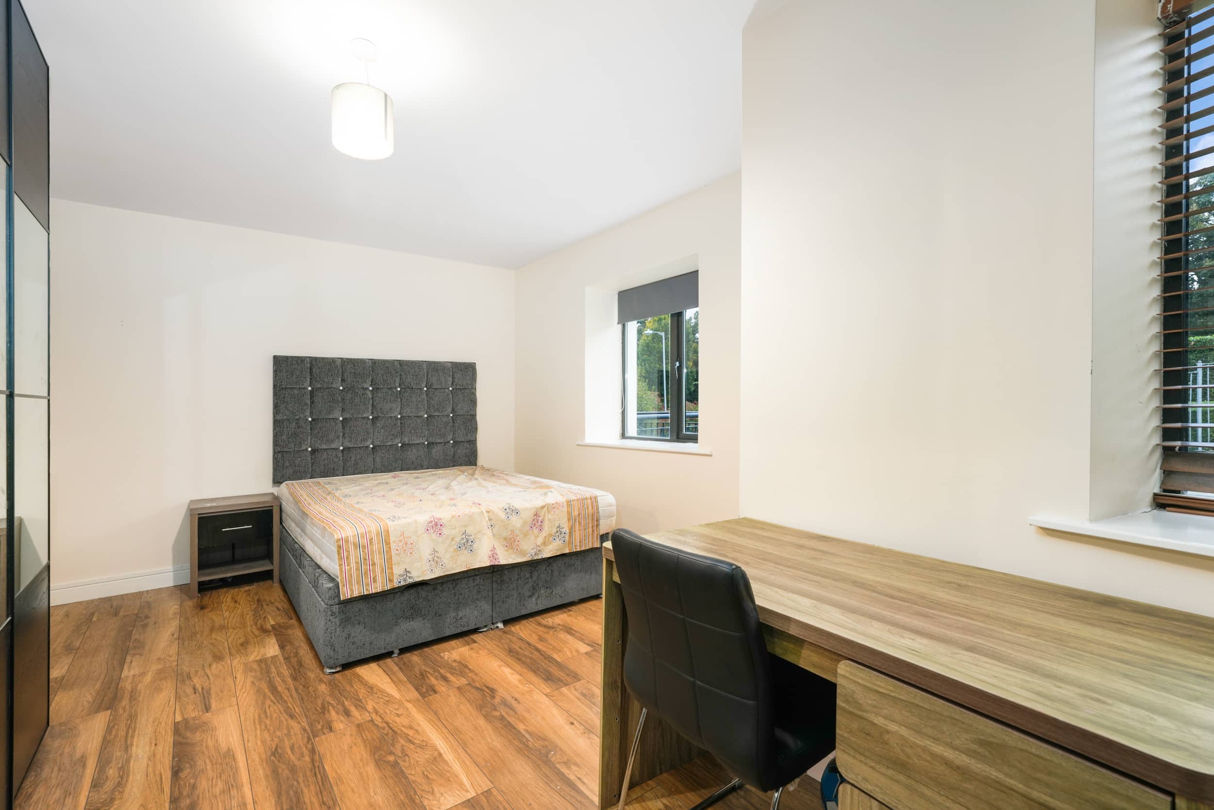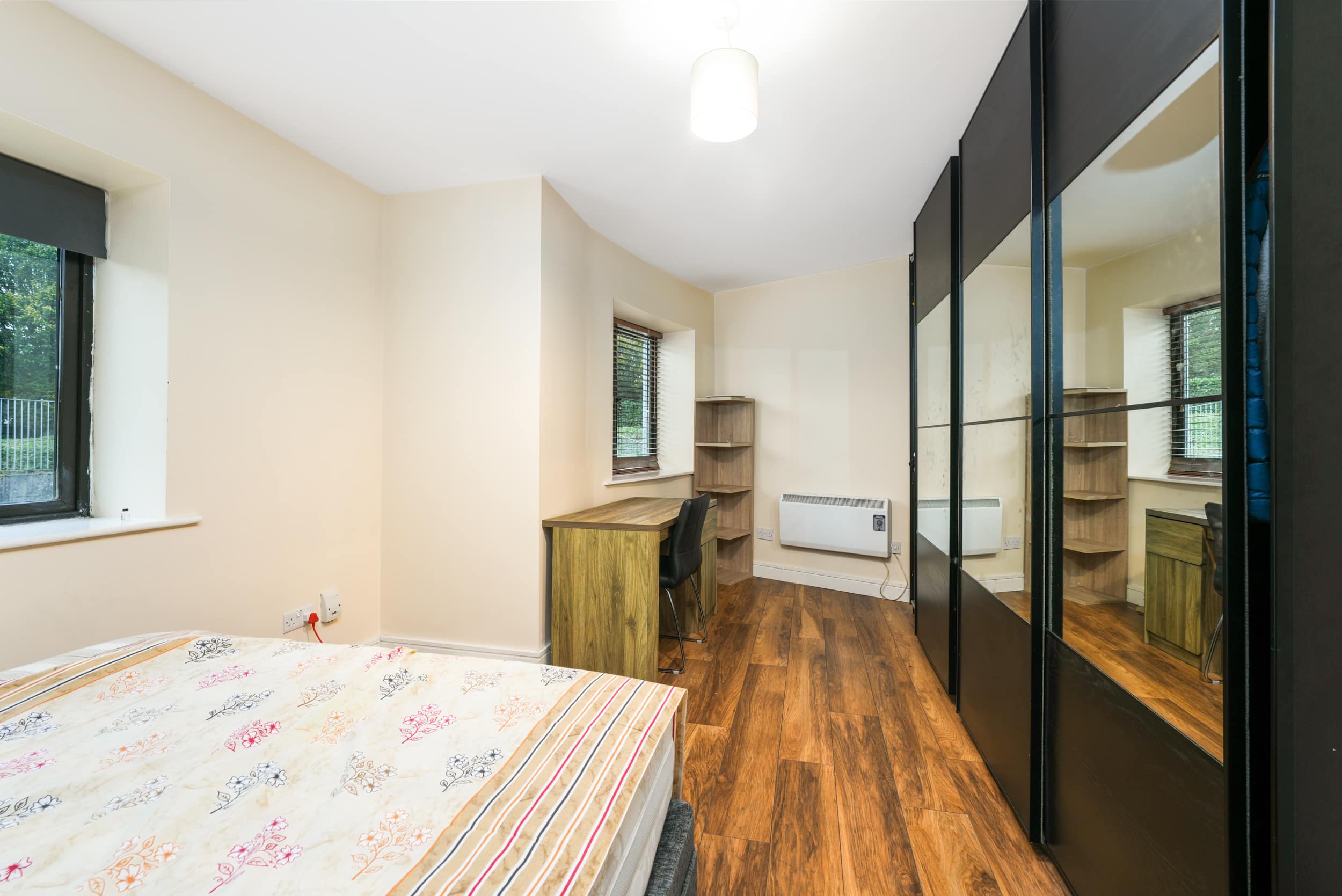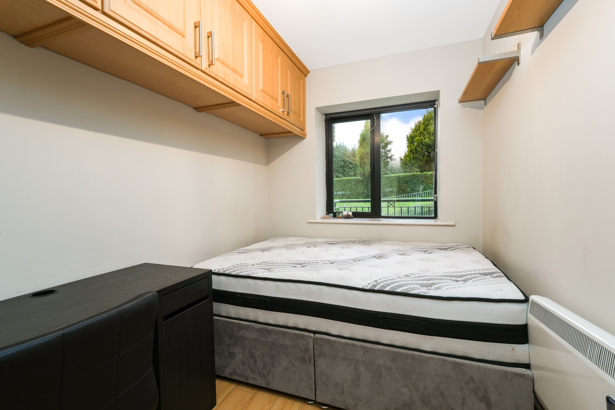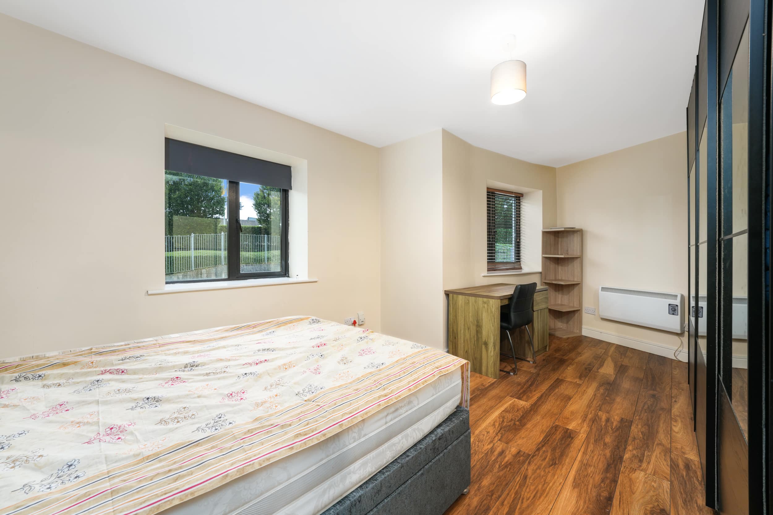 Upon entering, you are welcomed into a bright hallway providing access to all rooms. The master bedroom is a generous double with fully fitted wardrobes, while the second bedroom—located adjacent—is also well-proportioned. There is a spacious bathroom fitted with a toilet, hand basin, bath, and stand-up shower.
