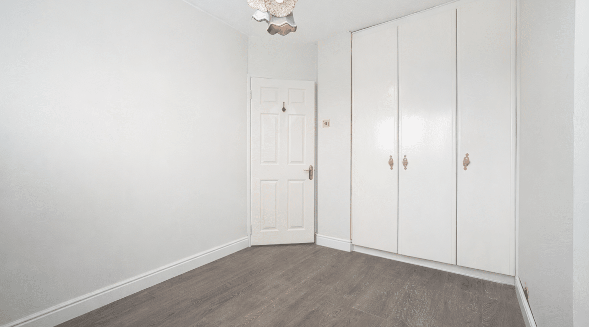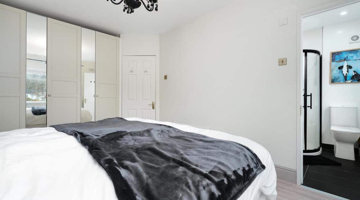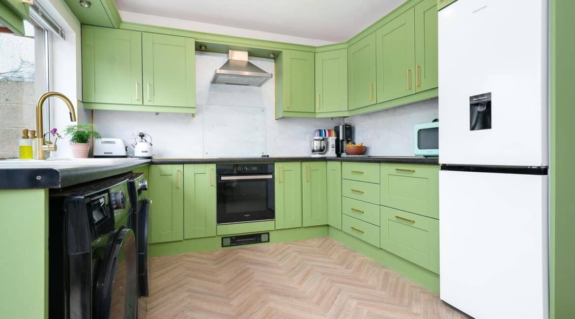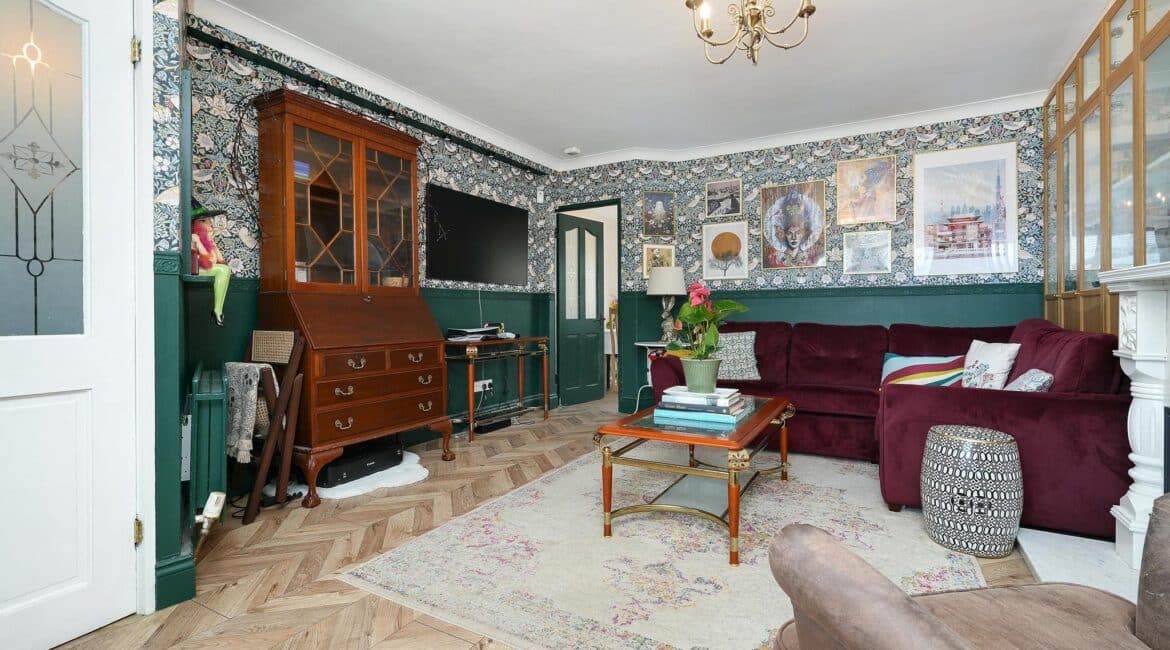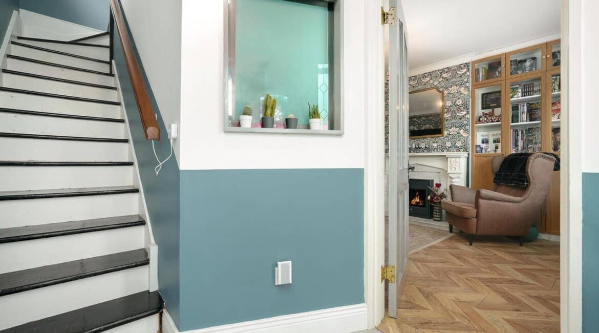 The ground floor layout is both practical and stylish. To the front, the large living room offers a warm and inviting space with bespoke built in sheves. Just beyond, the open-plan kitchen and dining area spans the width of the house and is flooded with natural light thanks to the large rear windows. The kitchen is well-appointed with modern cabinetry, ample counter space, and integrated appliances — ideal for cooking and casual dining. This area seamlessly connects to the low maintenance rear garden, a private outdoor retreat thats not overlooked.