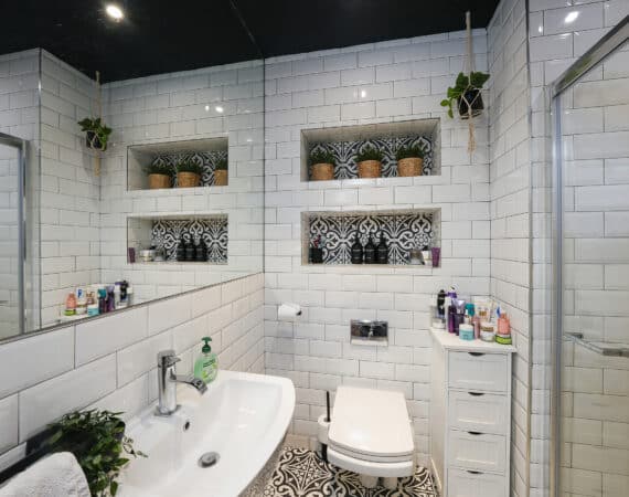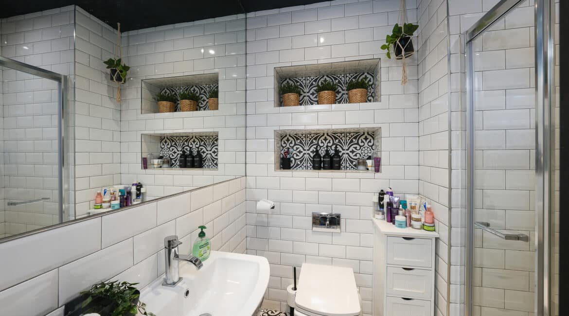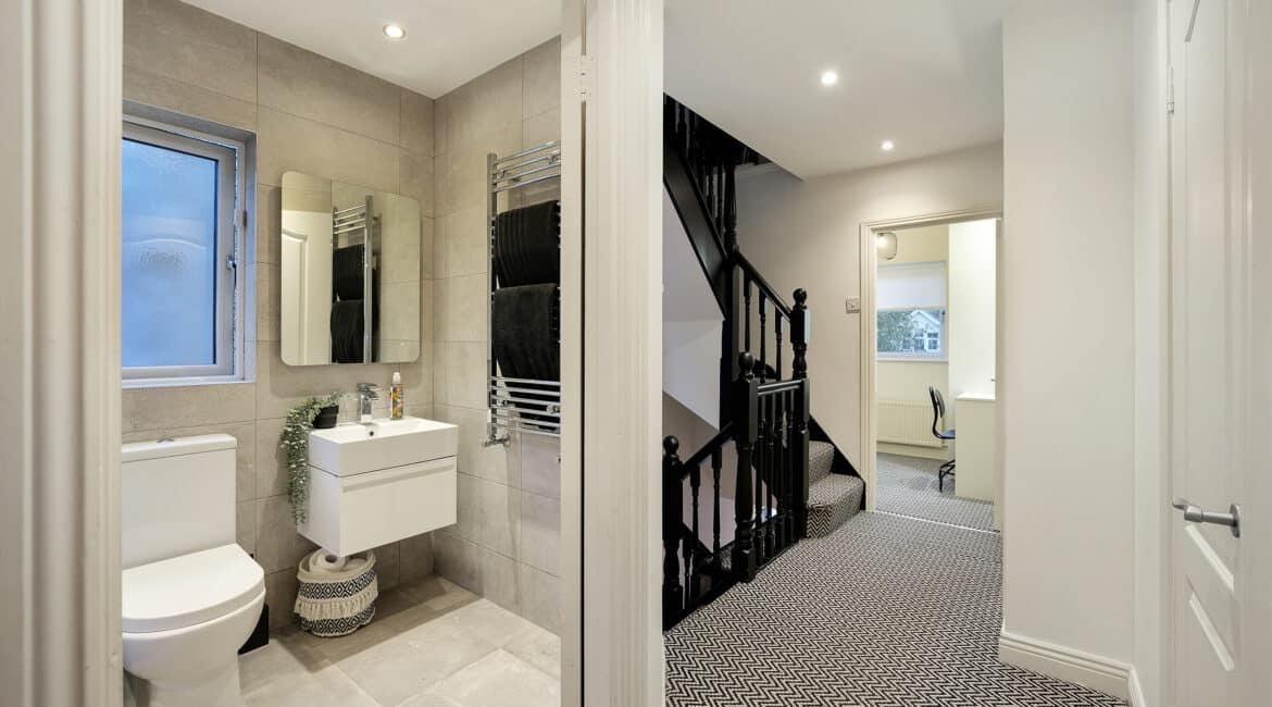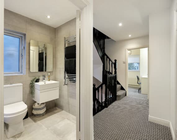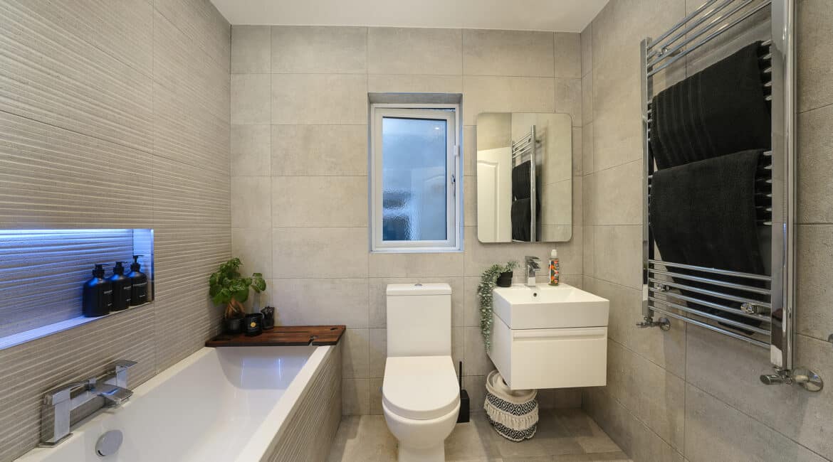 – Main family bathroom fully tiled