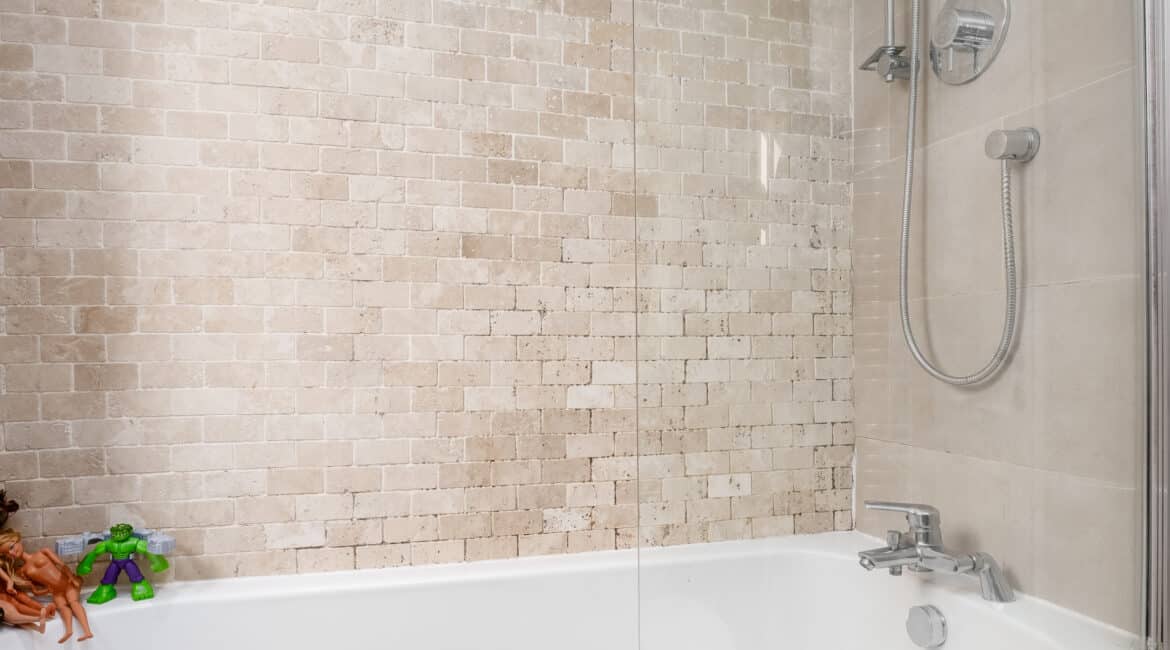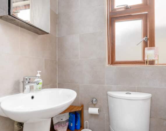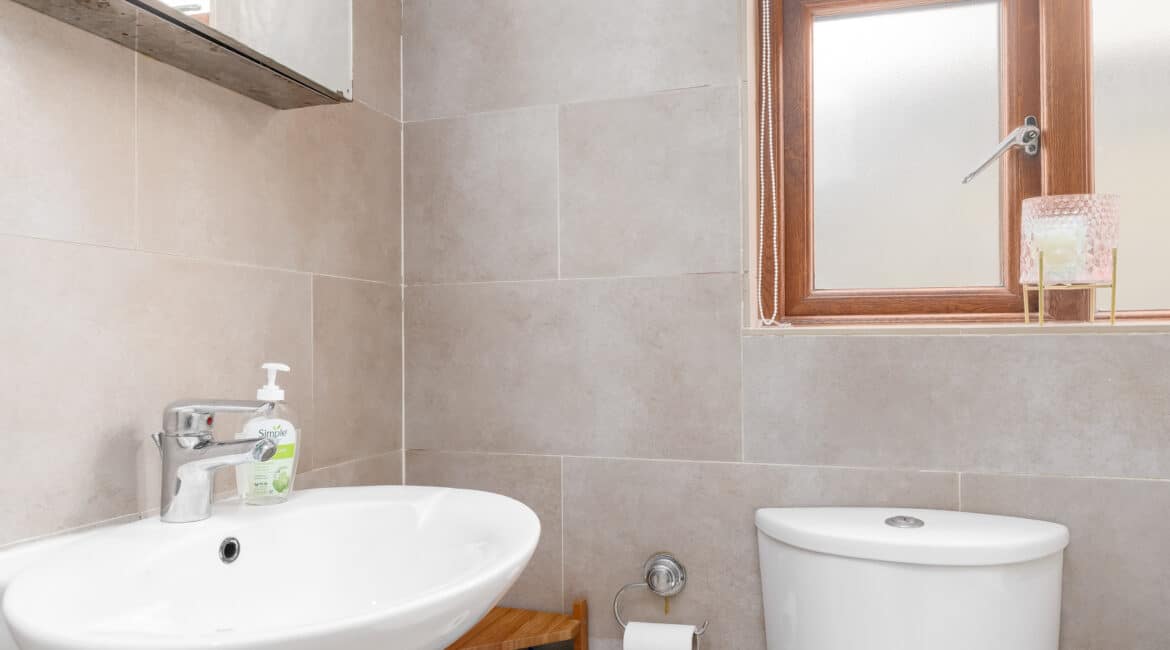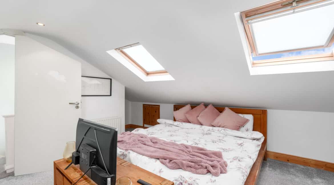 Off the living room, a hallway leads to a contemporary family bathroom complete with a hand basin, WC, and bath with shower, as well as two spacious double bedrooms. Upstairs, a converted attic provides a versatile third bedroom, featuring skylights and built-in storage.