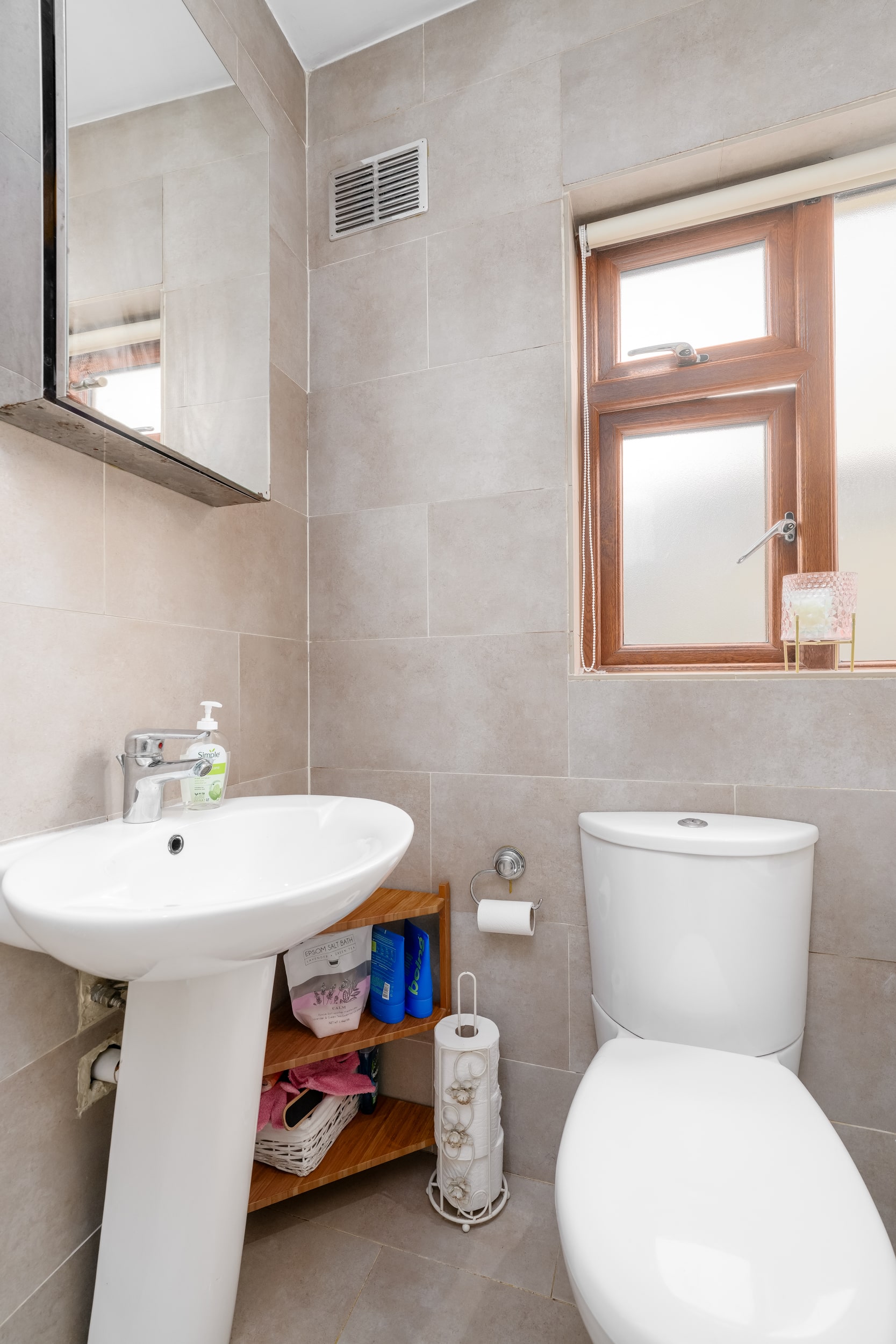 Off the living room, a hallway leads to a contemporary family bathroom complete with a hand basin, WC, and bath with shower, as well as two spacious double bedrooms. Upstairs, a converted attic provides a versatile third bedroom, featuring skylights and built-in storage.