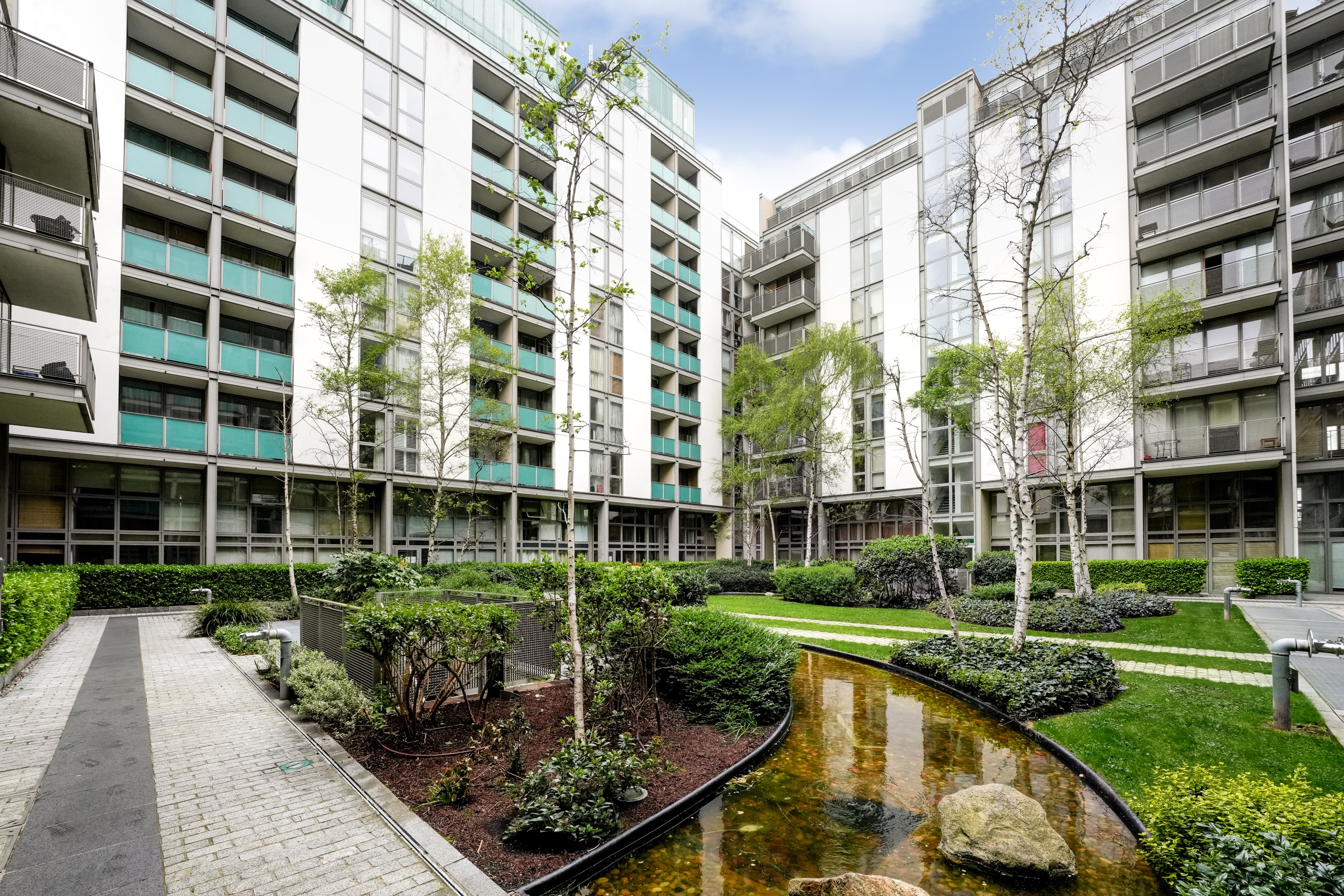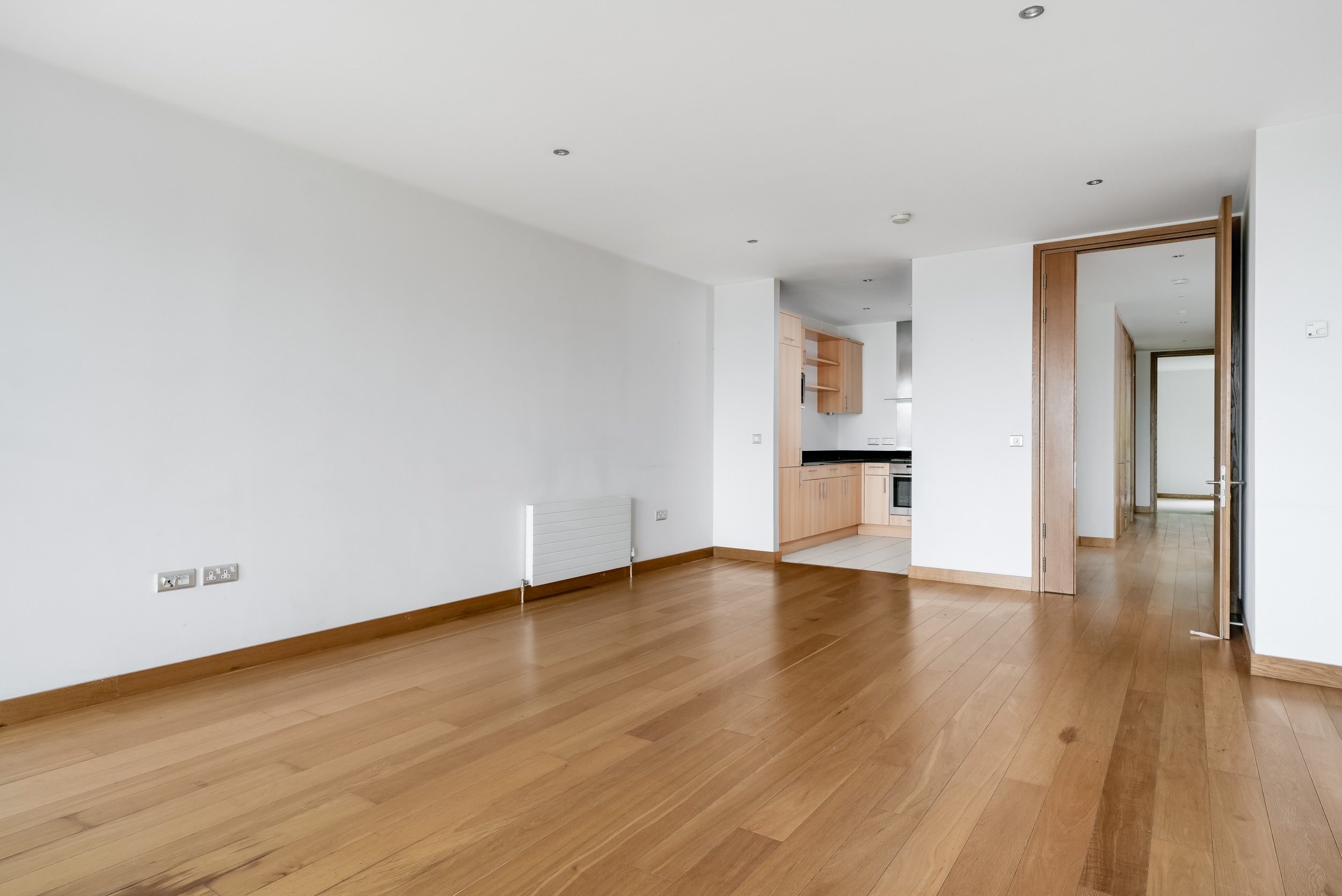 The accommodation is bright and generously proportioned, comprising a welcoming entrance hallway with ample storage. This leads into a large open-plan kitchen/living/dining area, complete with a fully fitted kitchen and flooded with natural light. The living space opens onto a substantial private balcony overlooking the canal, offering a peaceful setting ideal for relaxing or entertaining.