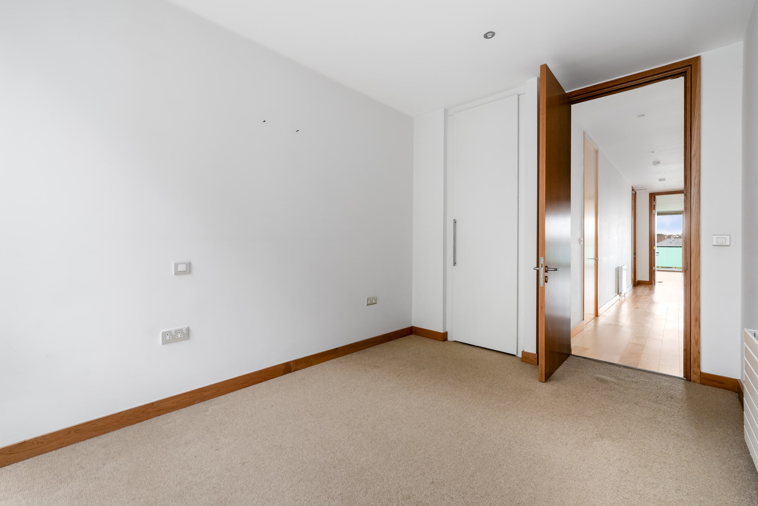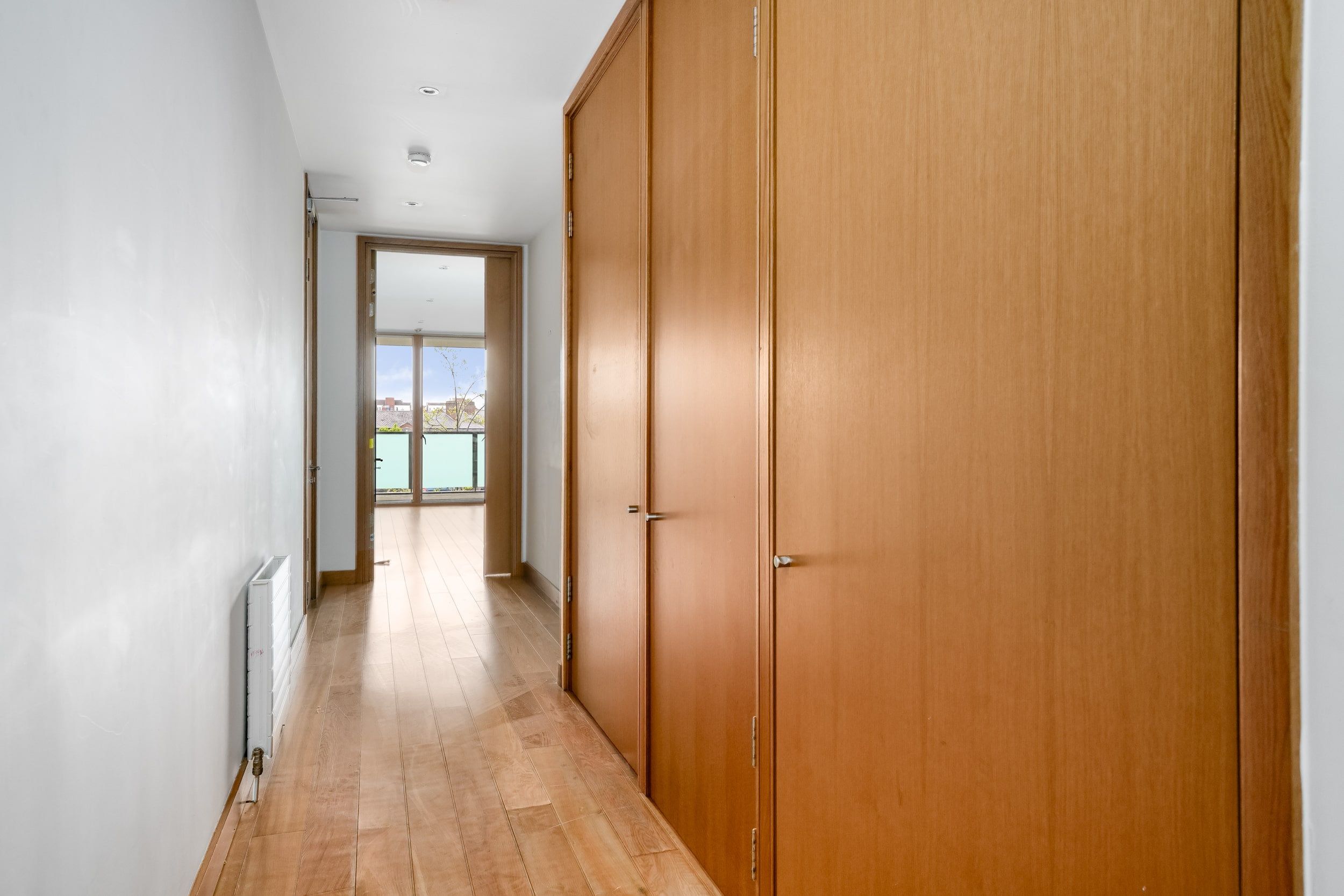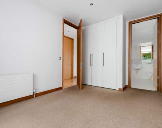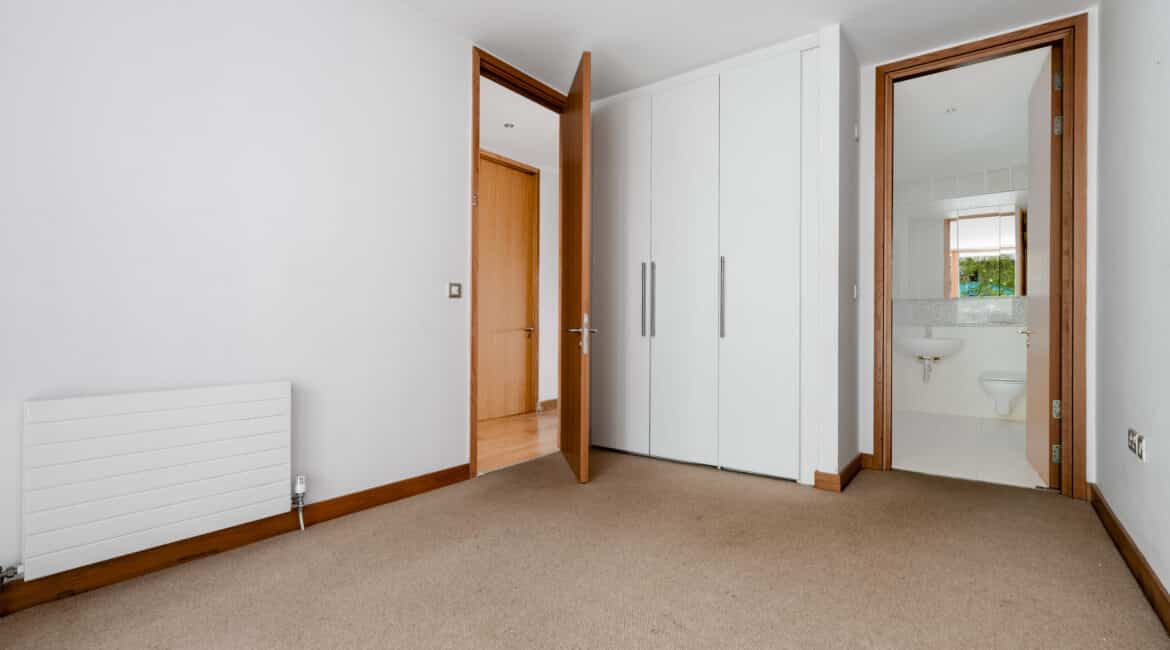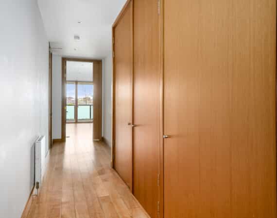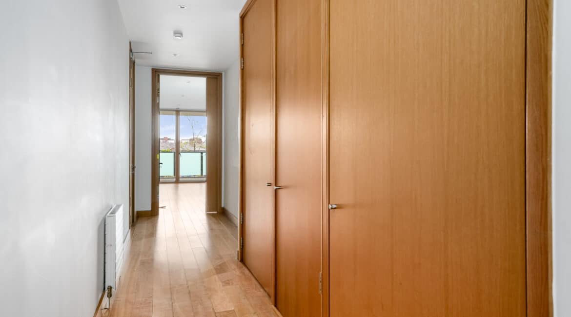 The hallway also leads to a well-appointed family bathroom, a spacious double bedroom with built-in wardrobes, and a master bedroom, also with built-in wardrobes and its own ensuite. Both bedrooms are positioned to the rear and enjoy access to a second private balcony overlooking a quiet internal courtyard.