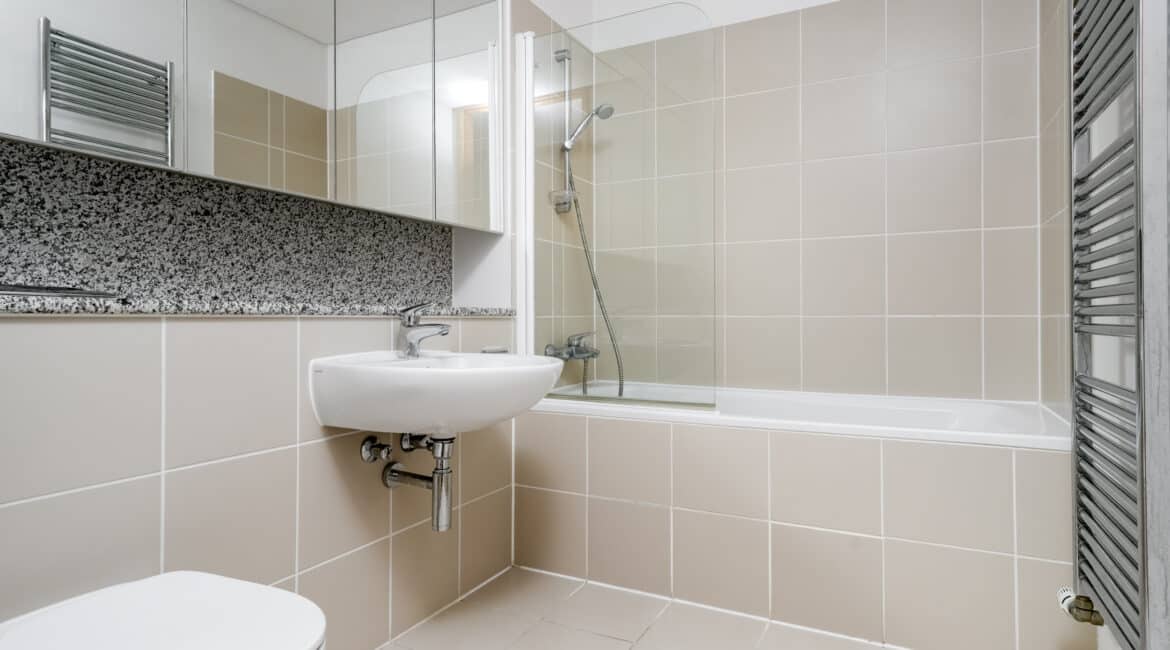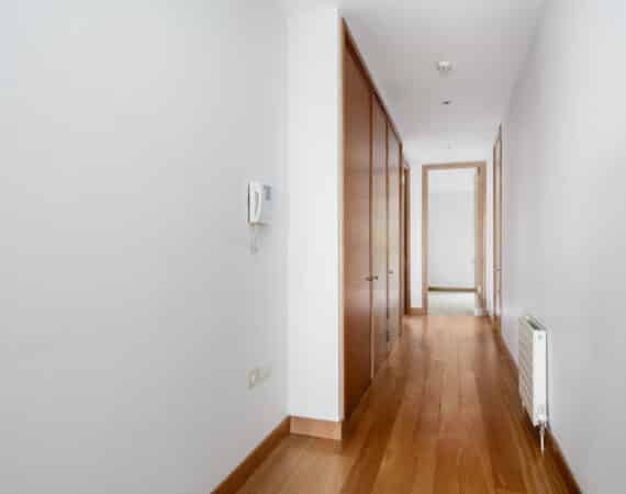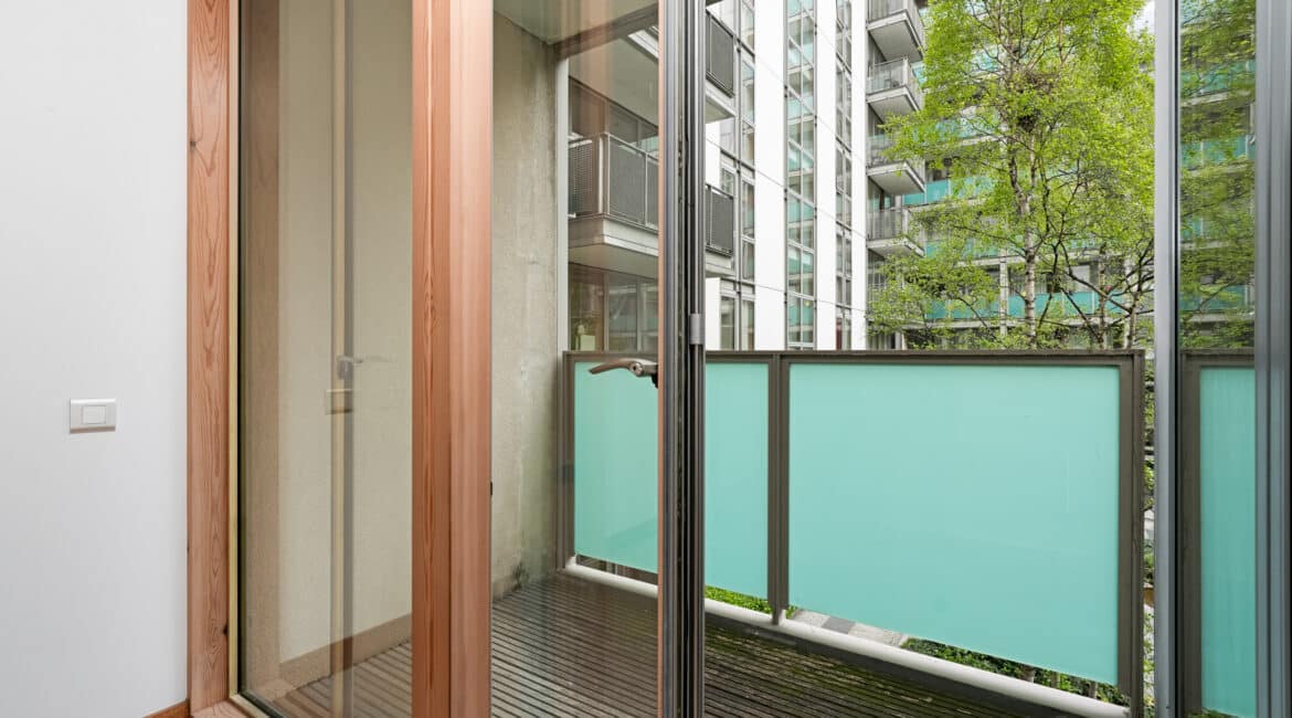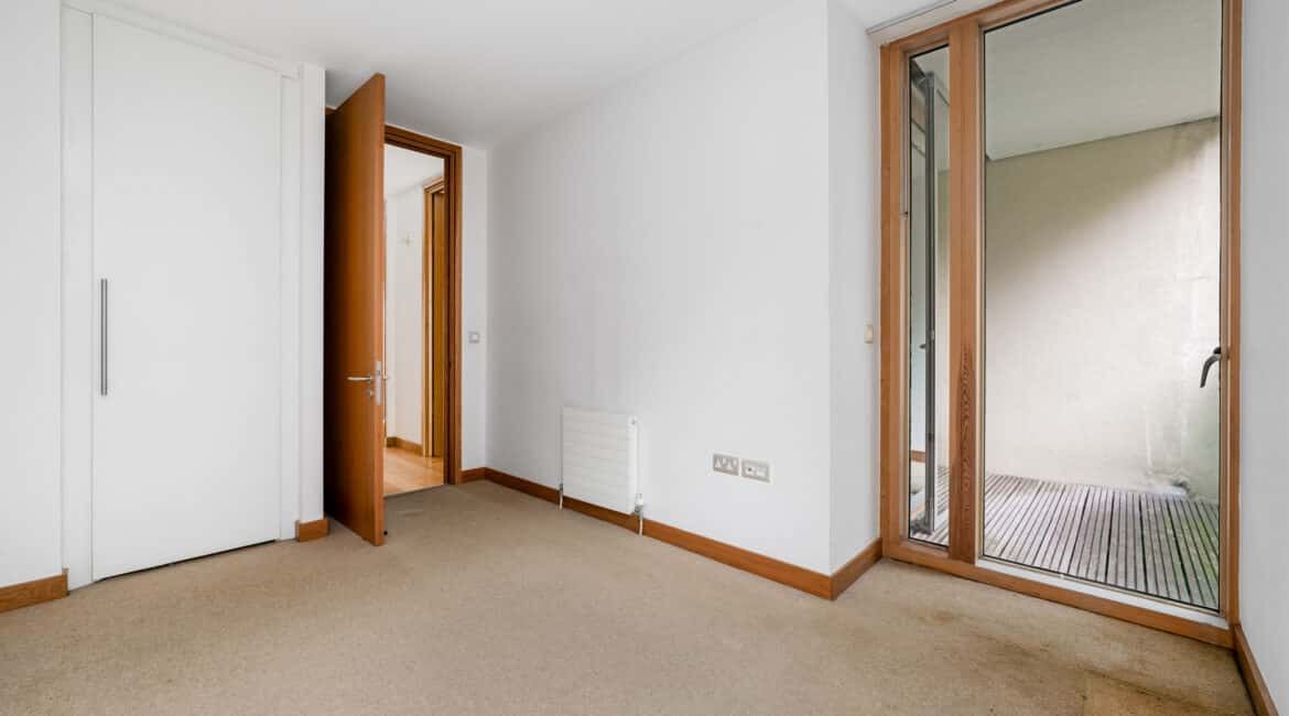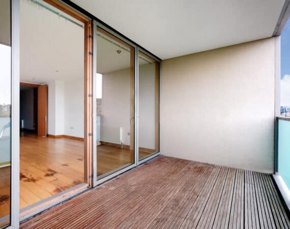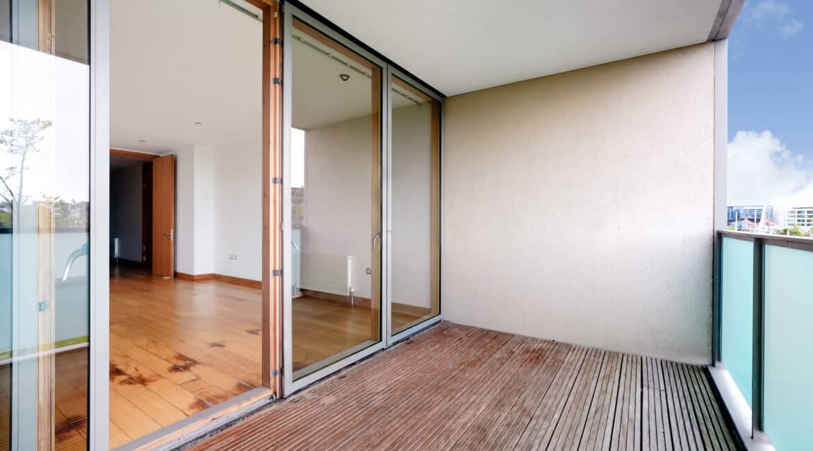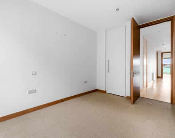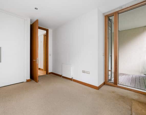 The hallway also leads to a well-appointed family bathroom, a spacious double bedroom with built-in wardrobes, and a master bedroom, also with built-in wardrobes and its own ensuite. Both bedrooms are positioned to the rear and enjoy access to a second private balcony overlooking a quiet internal courtyard.