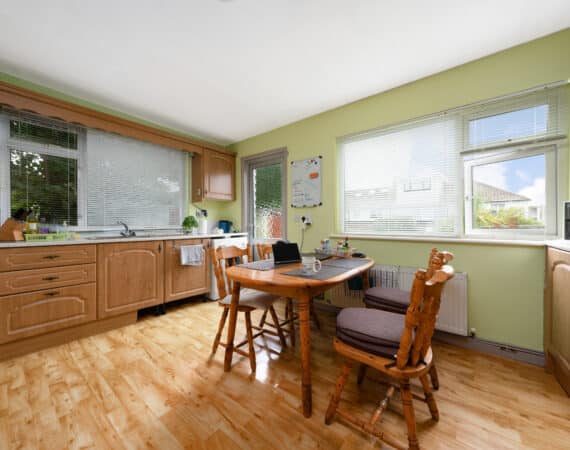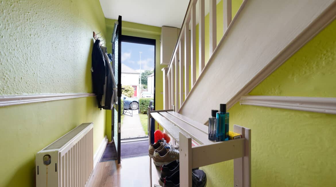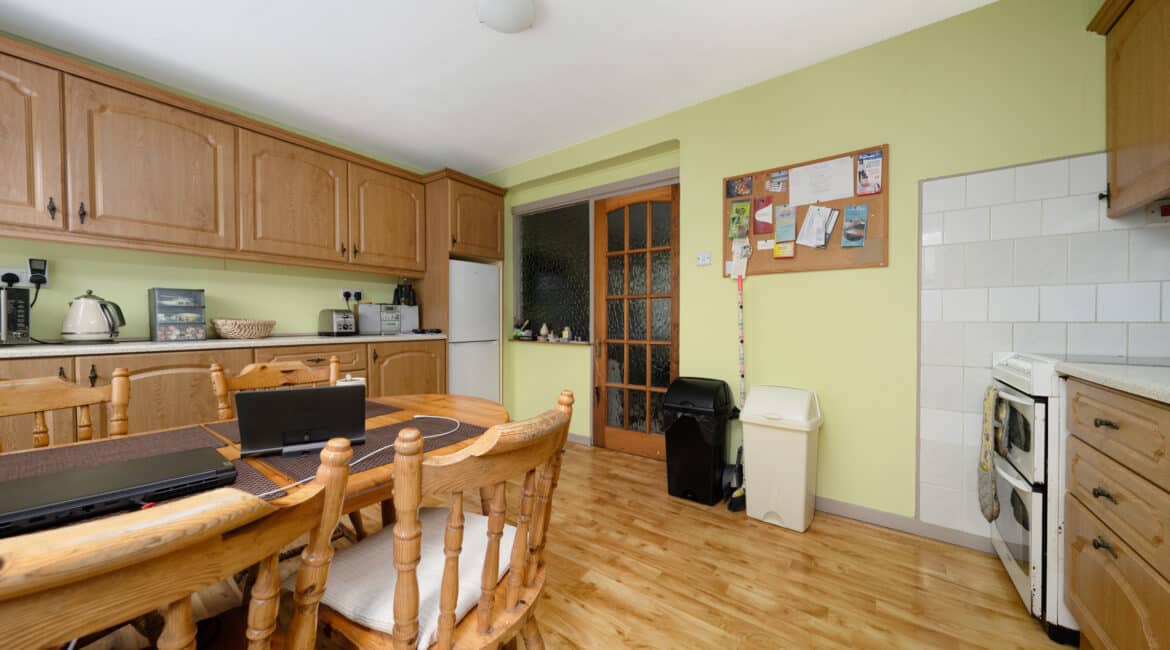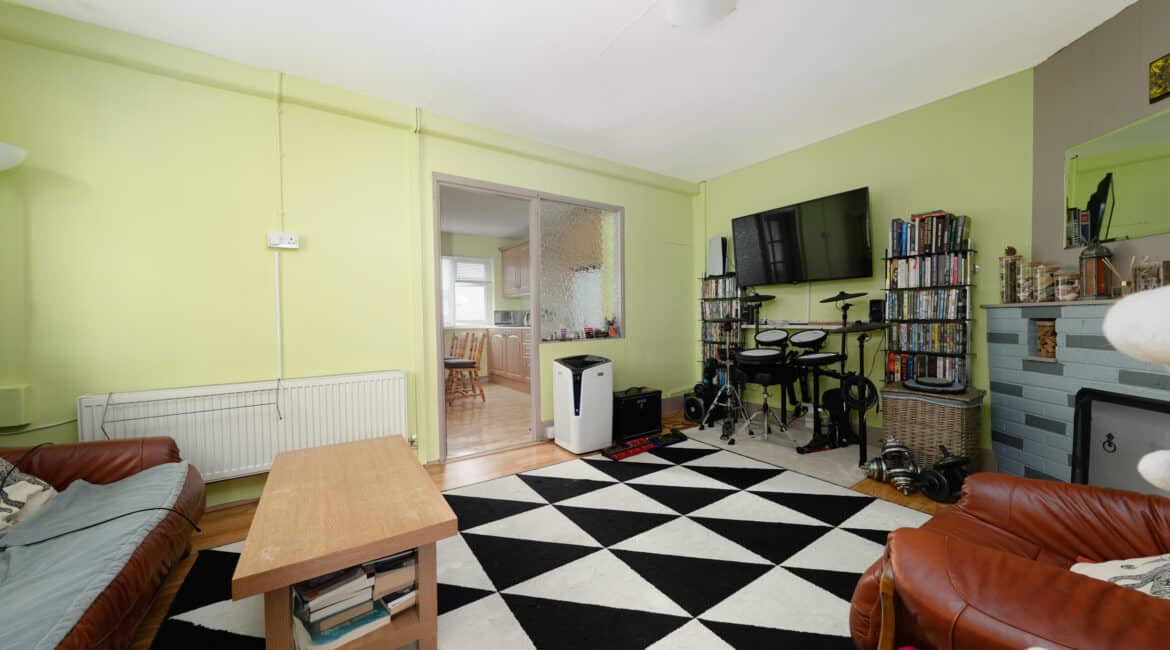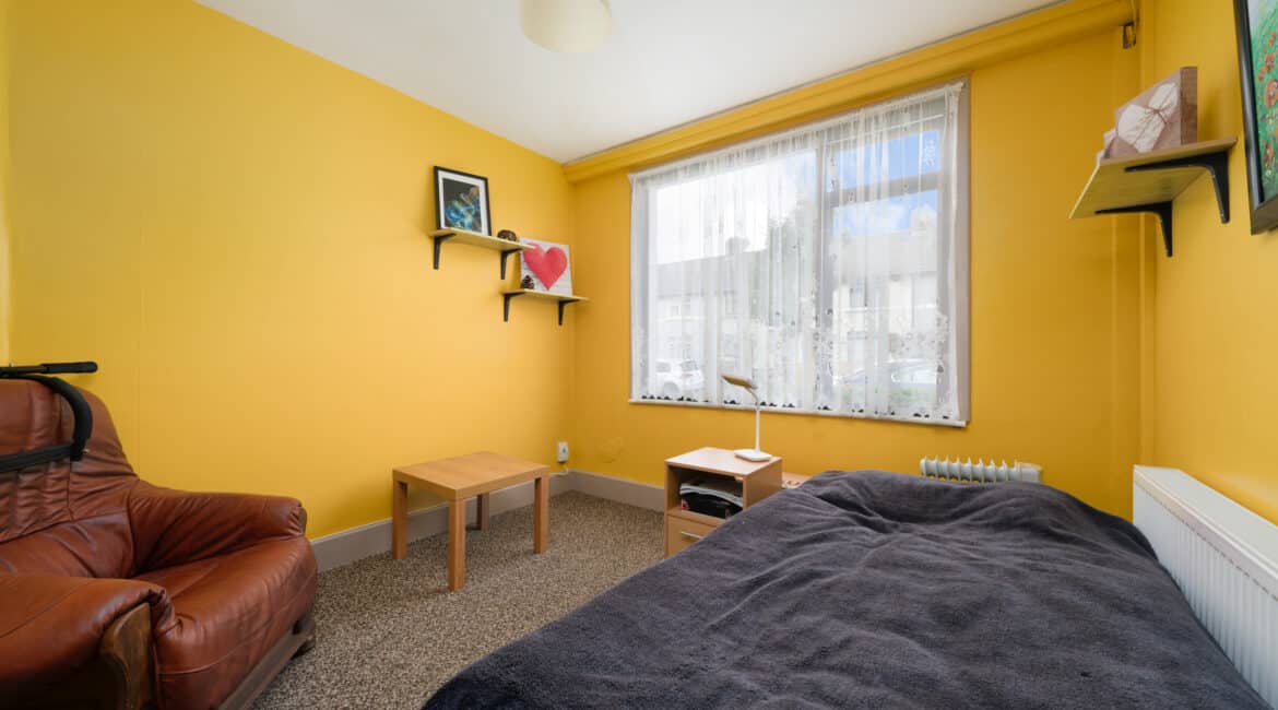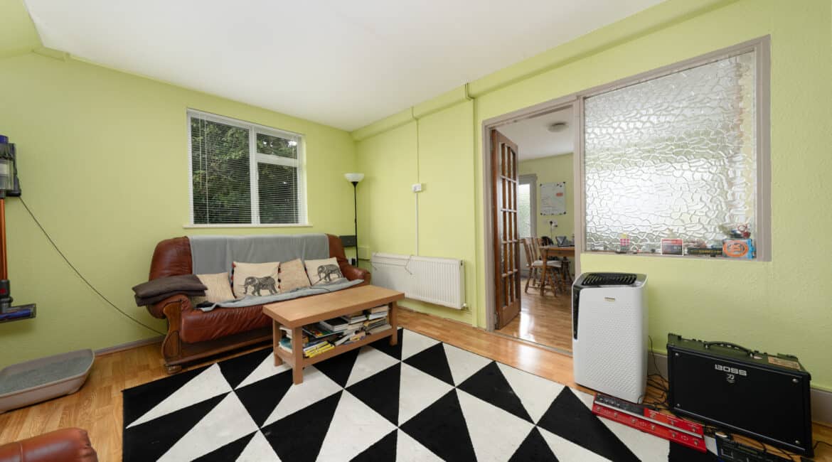 Spanning approximately 78 sq.m, the internal accommodation is both bright and well-appointed. The ground floor comprises a welcoming entrance hallway, a front reception room/third bedroom, a comfortable living room, and a spacious extended kitchen to the rear with direct access to a south-east facing garden—ideal for morning sunshine. Upstairs, you’ll find two generous double bedrooms, both with ample storage, and a fully tiled family bathroom.
