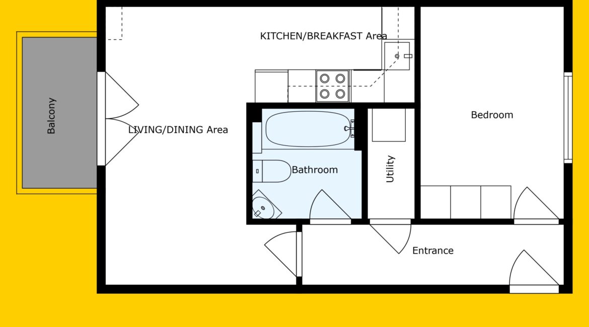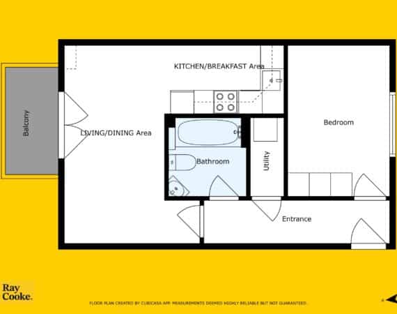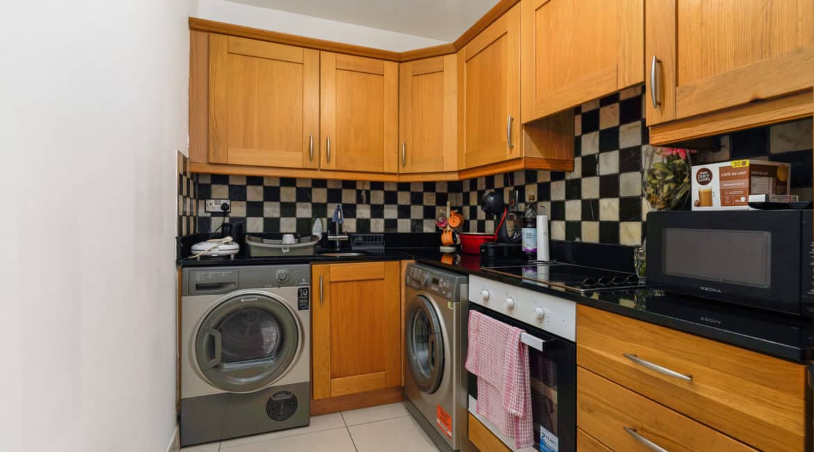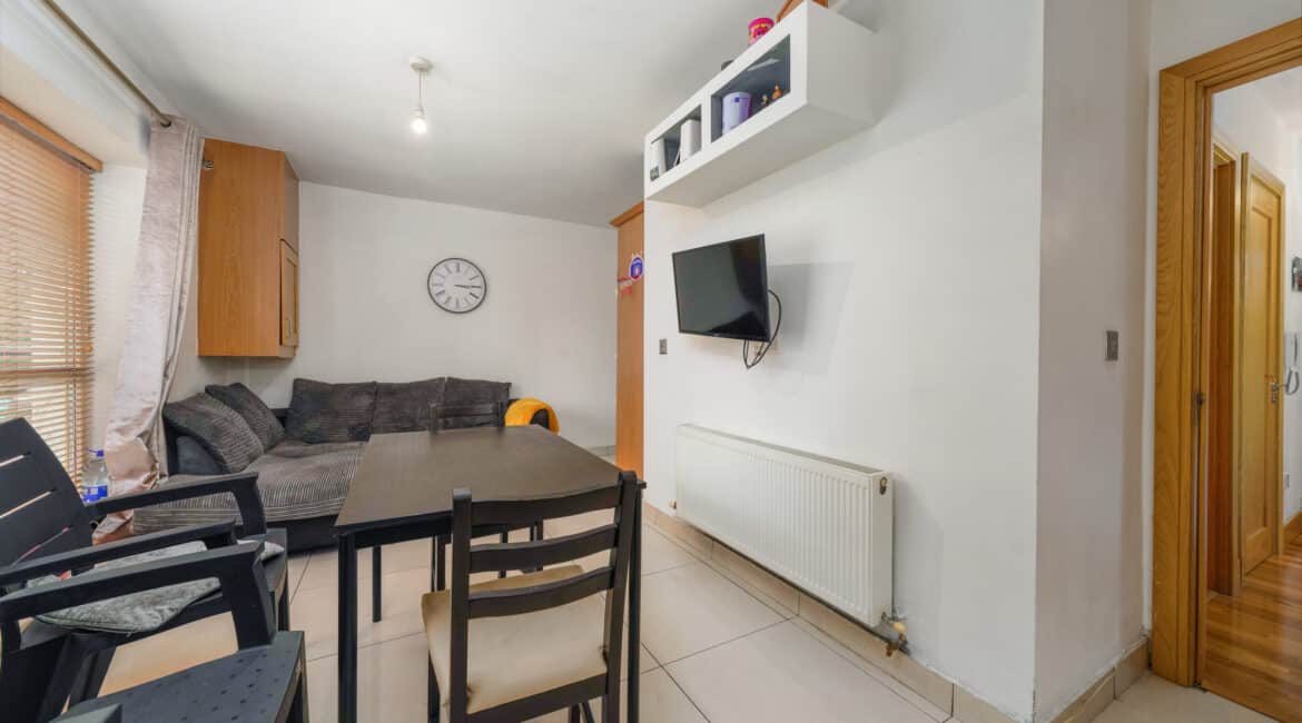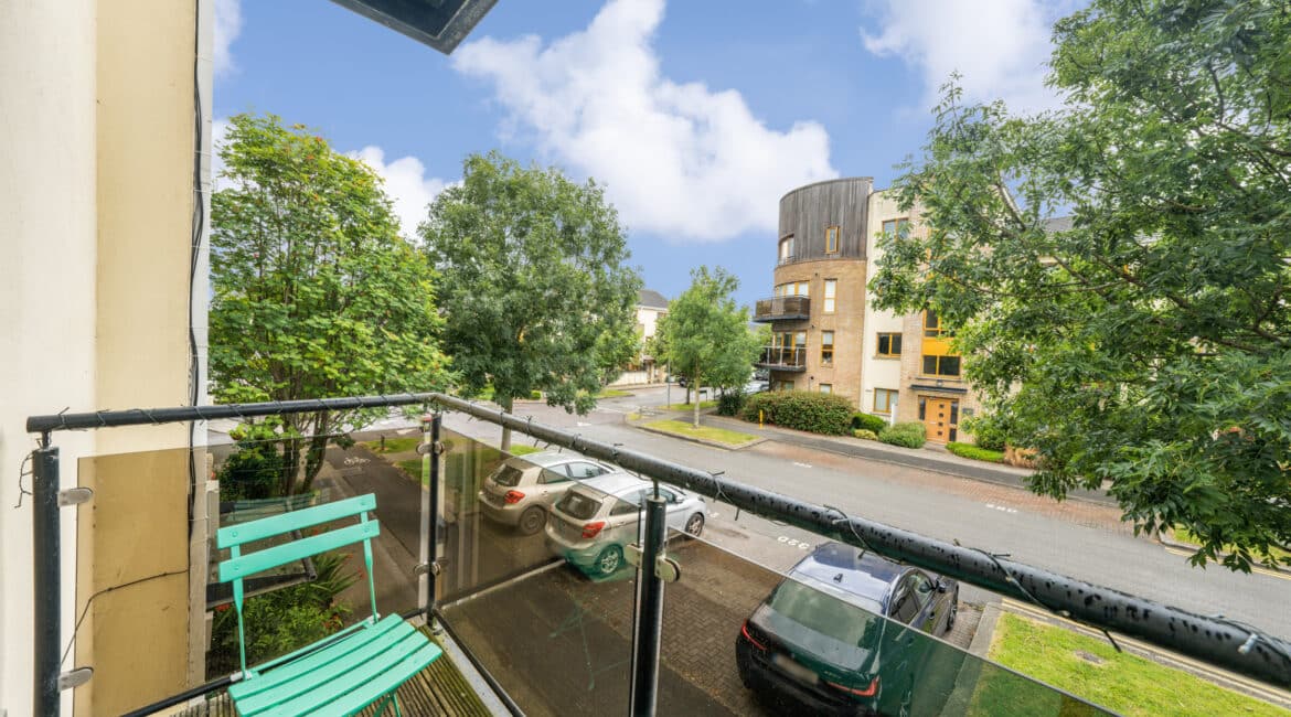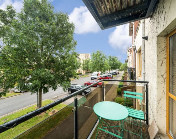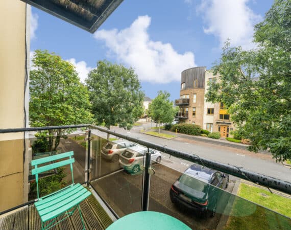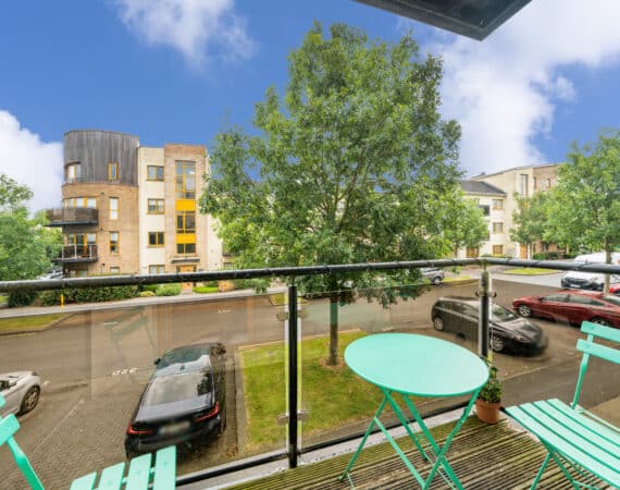 The accommodation extends to approximately 42 sq.m and comprises a smart entrance hallway, a bright and airy open-plan kitchen/dining/living room with access to a private balcony, a generous double bedroom with built-in wardrobes, and a stylish family bathroom with bath and overhead shower.