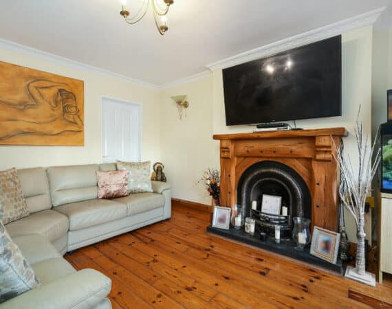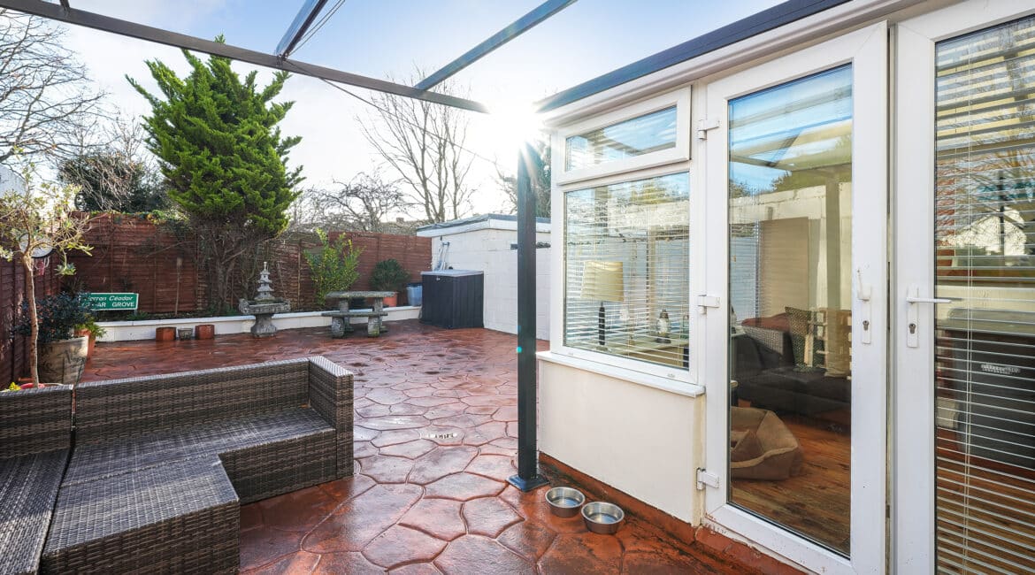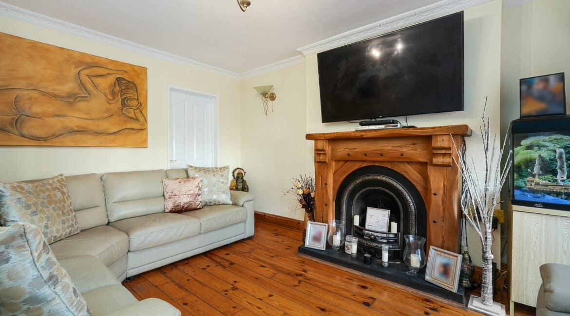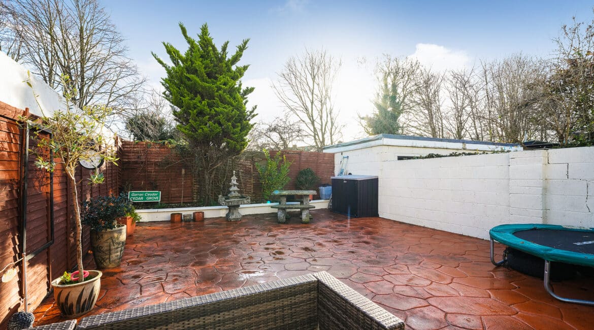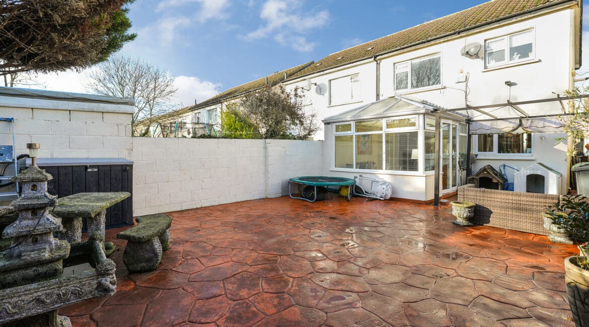 Internally, the property offers approximately 93 sq.m of bright, well-proportioned accommodation. The ground floor comprises an inviting entrance hallway, a spacious lounge with fireplace, a fully fitted kitchen, an open-plan living/dining area, and a conservatory that opens onto a sunny south-facing rear garden. Upstairs, there are two generously sized double bedrooms, a single bedroom, and a family bathroom. Presented in good condition throughout, this home benefits from double-glazed windows, gas-fired central heating, built-in wardrobes, high-quality flooring, and a low-maintenance rear garden. To the rear lies a particularly private, sunny west-facing garden—ideal for outdoor dining and family activities—with the added bonus of a side entrance for extra convenience. No. 5 Huntstown Road offers a superb opportunity to acquire a home in a family-friendly location with all conveniences close to hand.