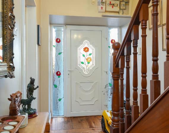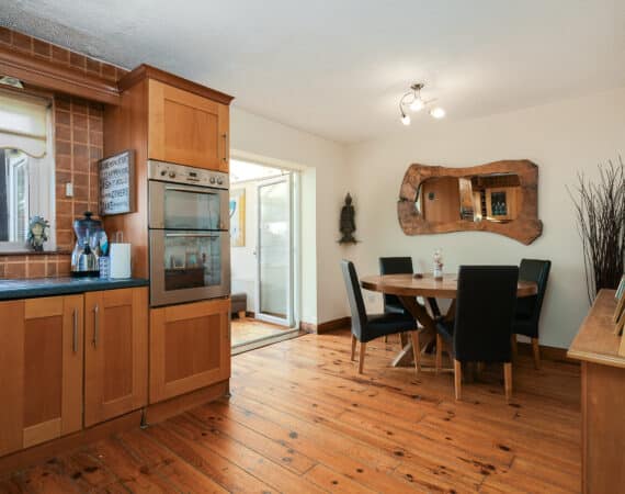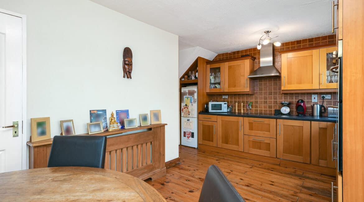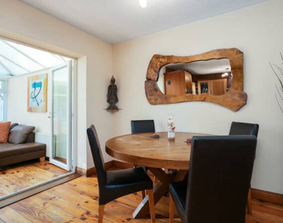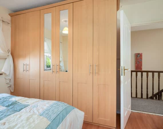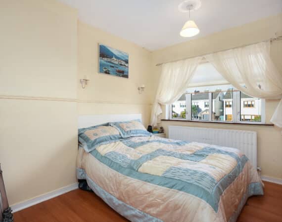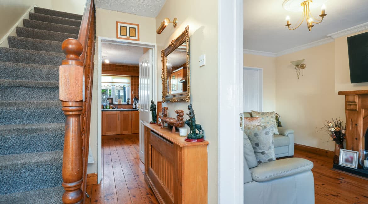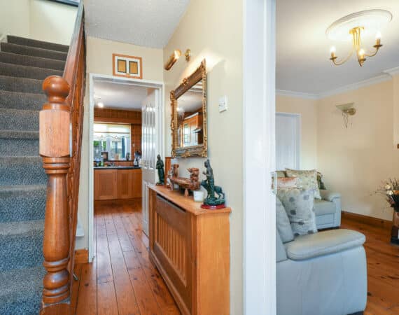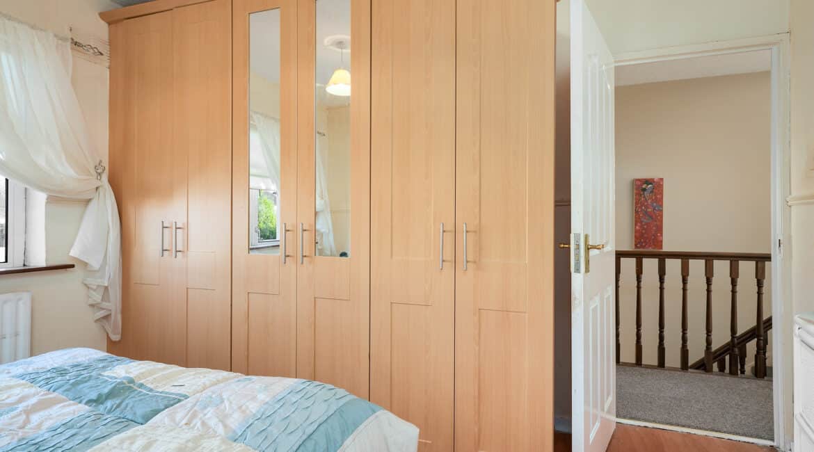 Internally, the property offers approximately 93 sq.m of bright, well-proportioned accommodation. The ground floor comprises an inviting entrance hallway, a spacious lounge with fireplace, a fully fitted kitchen, an open-plan living/dining area, and a conservatory that opens onto a sunny south-facing rear garden. Upstairs, there are two generously sized double bedrooms, a single bedroom, and a family bathroom. Presented in good condition throughout, this home benefits from double-glazed windows, gas-fired central heating, built-in wardrobes, high-quality flooring, and a low-maintenance rear garden. To the rear lies a particularly private, sunny west-facing garden—ideal for outdoor dining and family activities—with the added bonus of a side entrance for extra convenience. No. 5 Huntstown Road offers a superb opportunity to acquire a home in a family-friendly location with all conveniences close to hand.