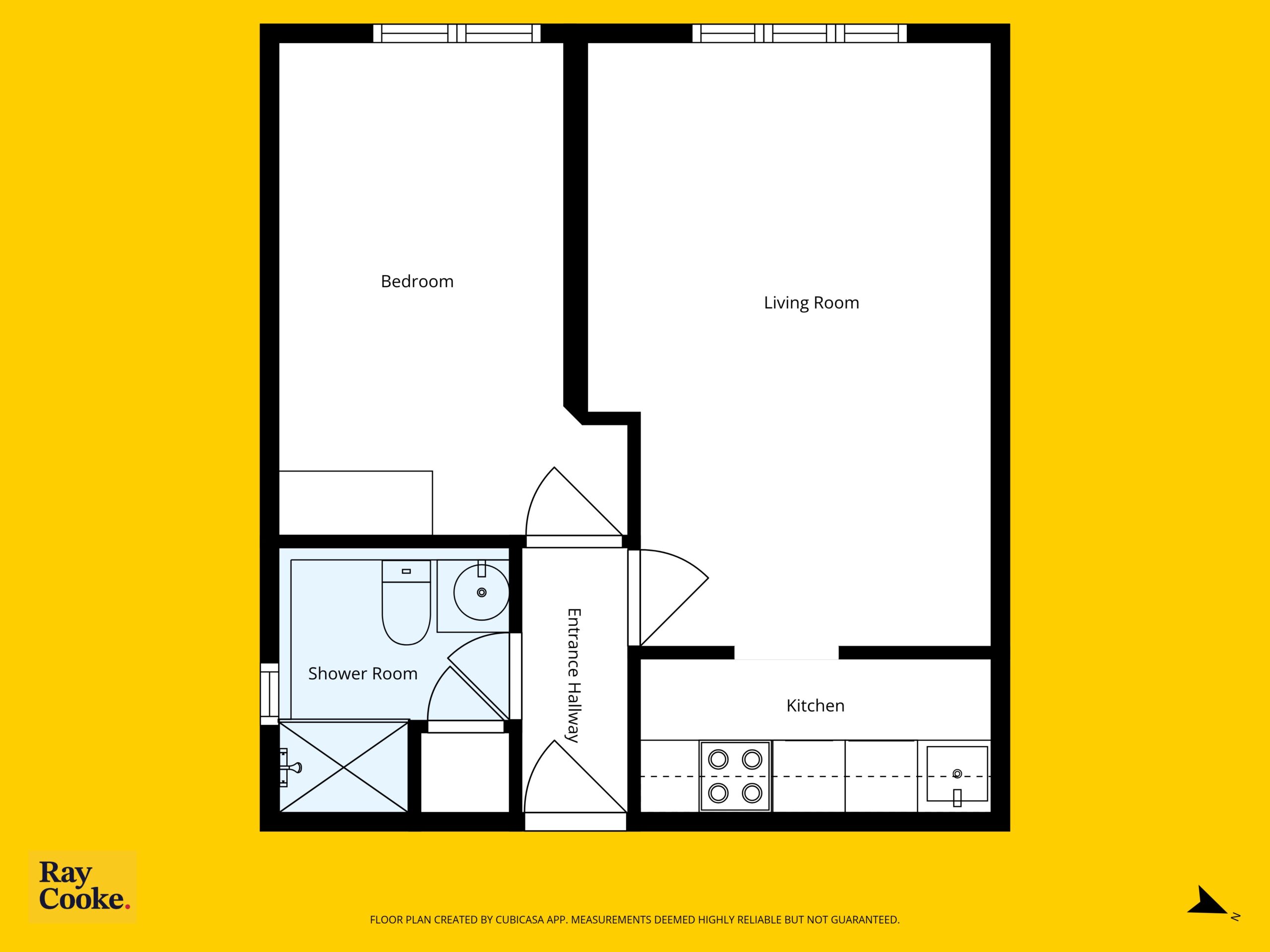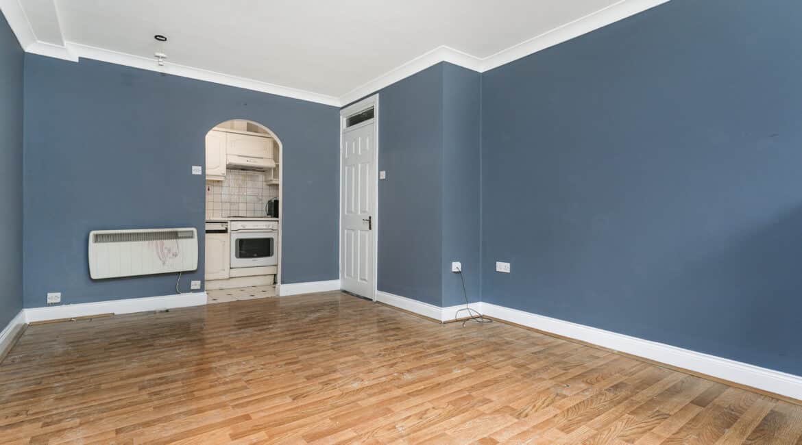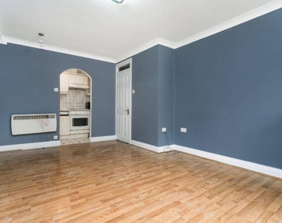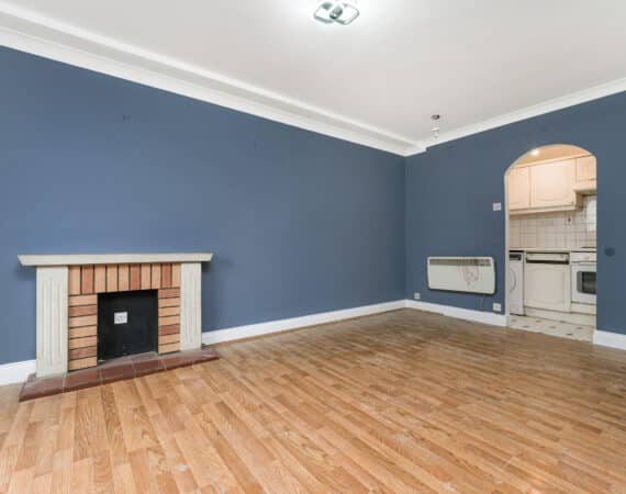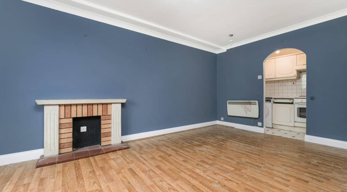 The internal accommodation comprises of an entrance hallway, a generous living/dining room with wood-effect laminate flooring and feature fireplace, a separate fully fitted kitchen with a range of wall and base units, a spacious double bedroom with fitted storage, and a fully tiled main bathroom complete with shower enclosure.