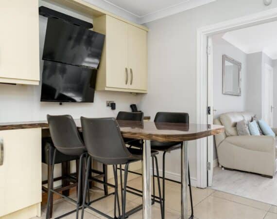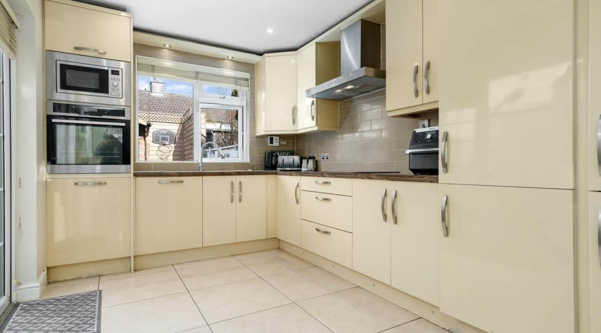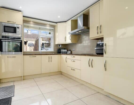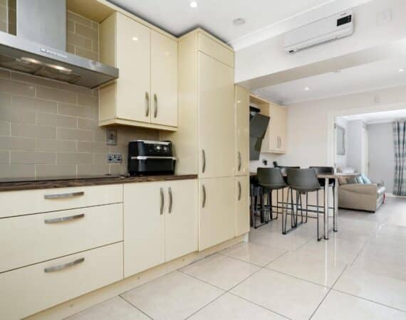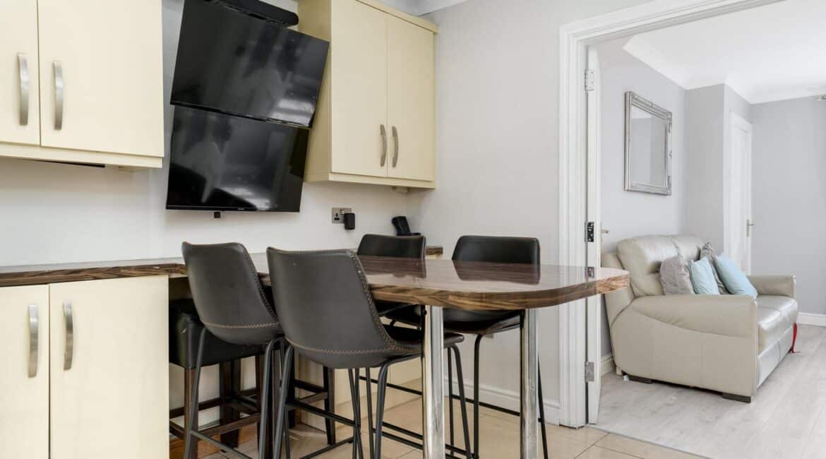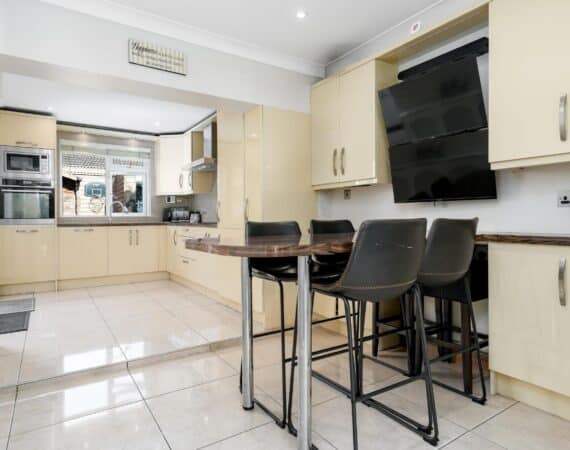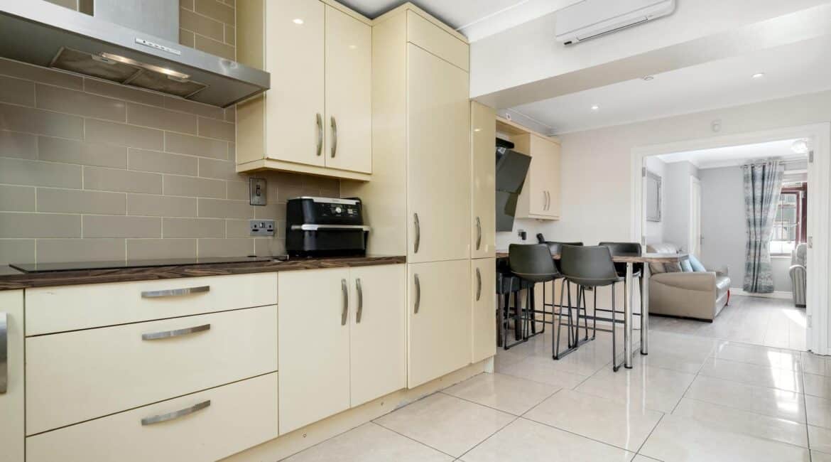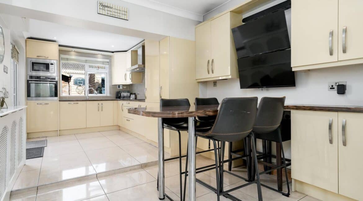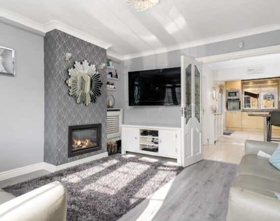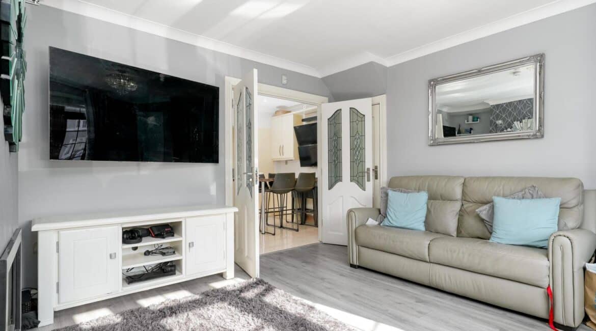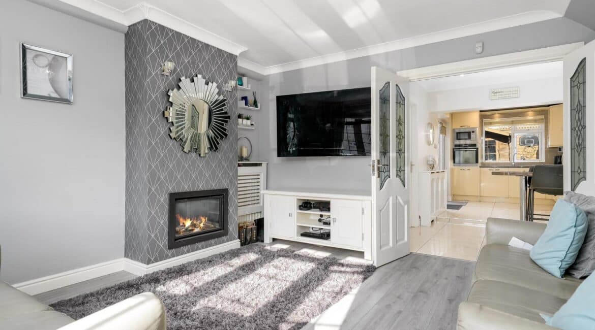 The ground floor accommodation is designed for modern living. A bright front living room features warm wood flooring and a contemporary electric fireplace, creating a cosy focal point. To the rear, the property has been impressively extended to host a stunning open-plan kitchen and living area. This space is finished with sleek tiling throughout and boasts a premium fully fitted kitchen with ample countertop space and extensive storage solutions. A stylish, fully tiled family bathroom completes the ground floor layout.