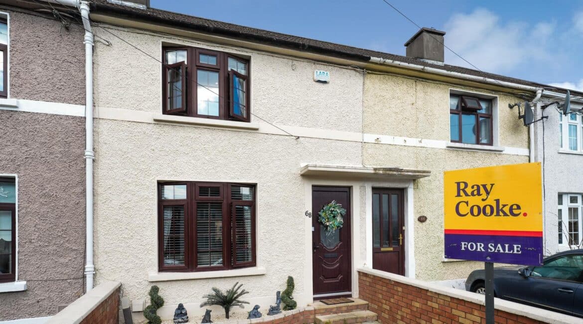 Traveling along the Ballyfermot Road toward the City Centre, pass the Gala Shopping Centre on your left. Take the right-hand turn onto Kylemore Road at the main junction. Continue straight and take the left turn onto Langan Road. Follow the road around, and Number 68 will be located on your left-hand side, identified by our for sale sign.