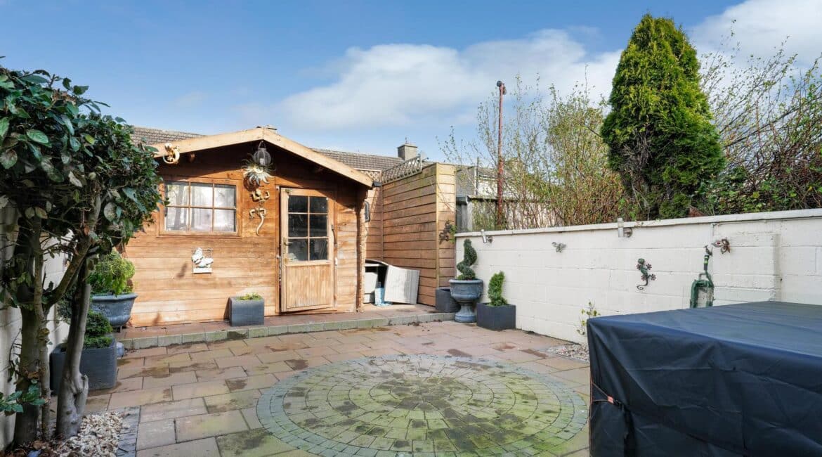 Large rear shed and low-maintenance paved garden