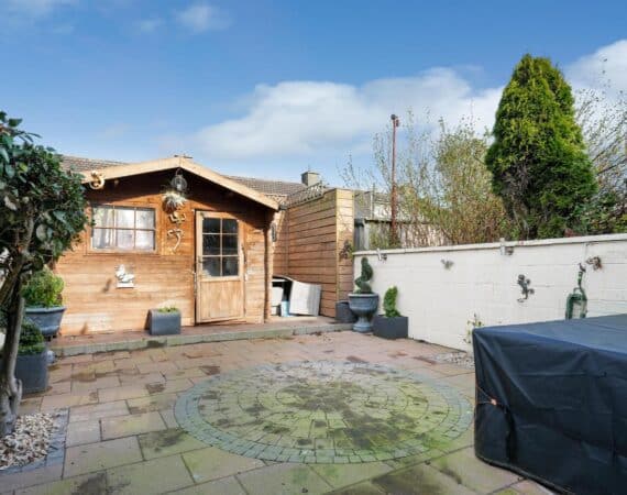 The exterior of the property is just as impressive. The rear garden features a low-maintenance paved area, perfect for outdoor entertaining, along with a large, solid-structure shed providing excellent additional storage or workshop potential.