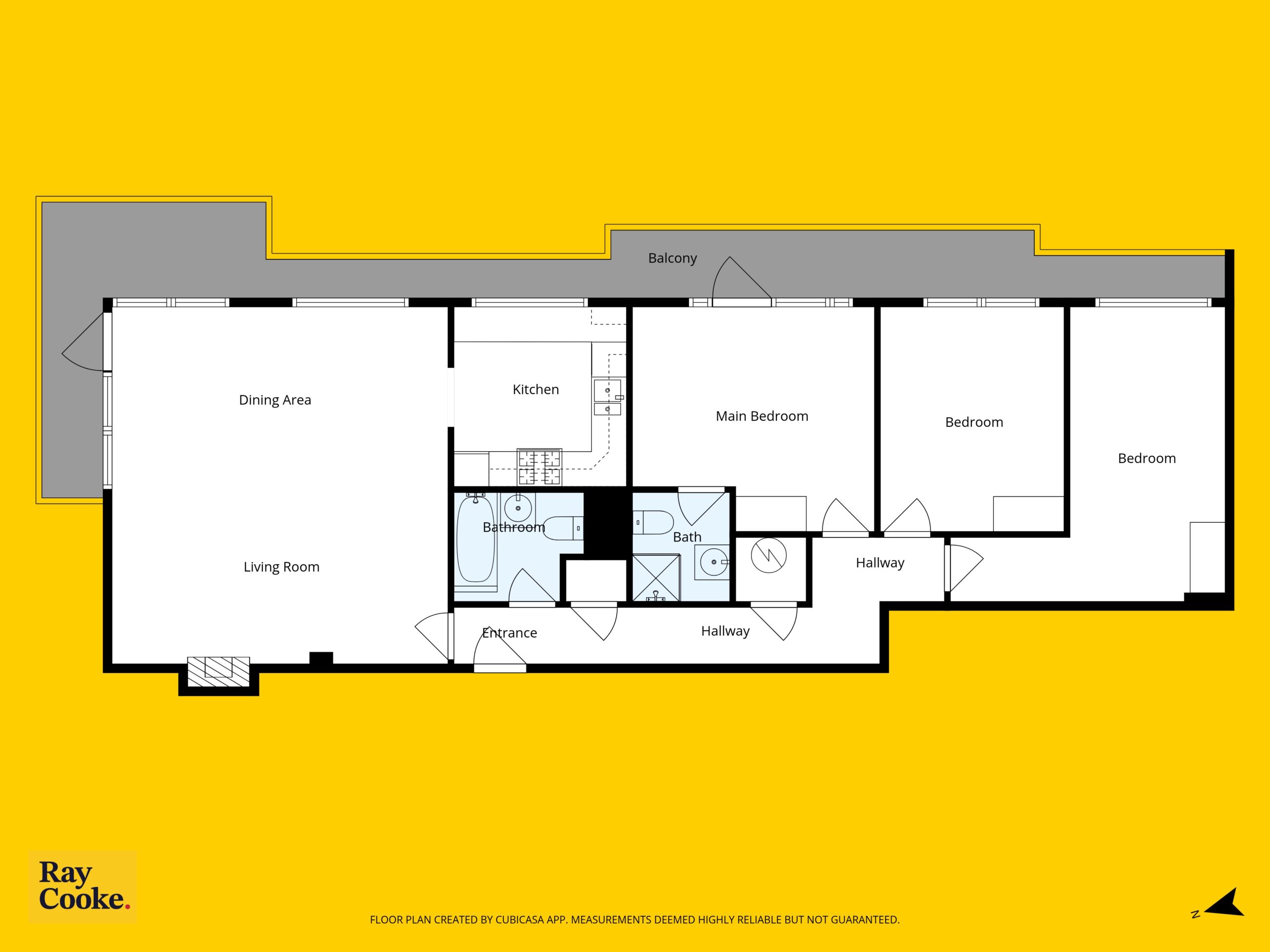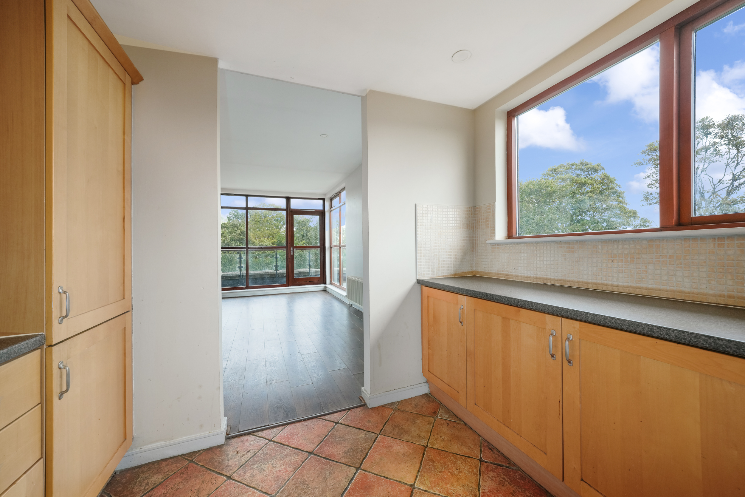 The accommodation extends to approximately 113 sq.m and comprises an inviting entrance hallway with storage, a spacious open-plan living and dining area with access to a sunny private balcony, and a separate fully fitted kitchen with ample counter and cupboard space. There are three large bedrooms, all with fitted wardrobes. The master bedroom features an ensuite bathroom and its own private balcony, while a contemporary main bathroom completes the layout. The apartment is presented in excellent condition throughout and further benefits from gas-fired central heating, double-glazed windows, lift access and a designated parking space within this well-managed development.