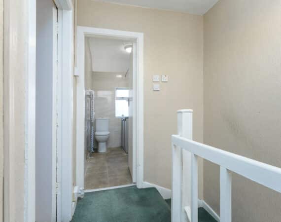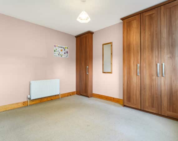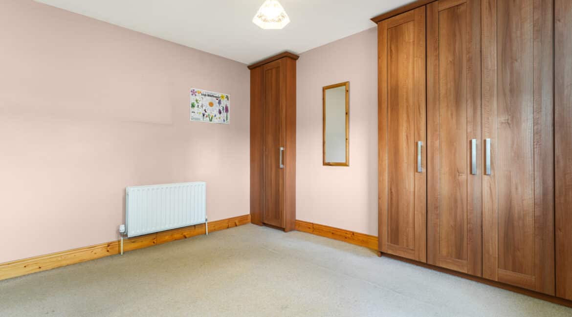 Upstairs hosts three bedrooms, including two double bedrooms (one with built-in wardrobes) and one single bedroom, along with a main family bathroom fitted with an electric shower.