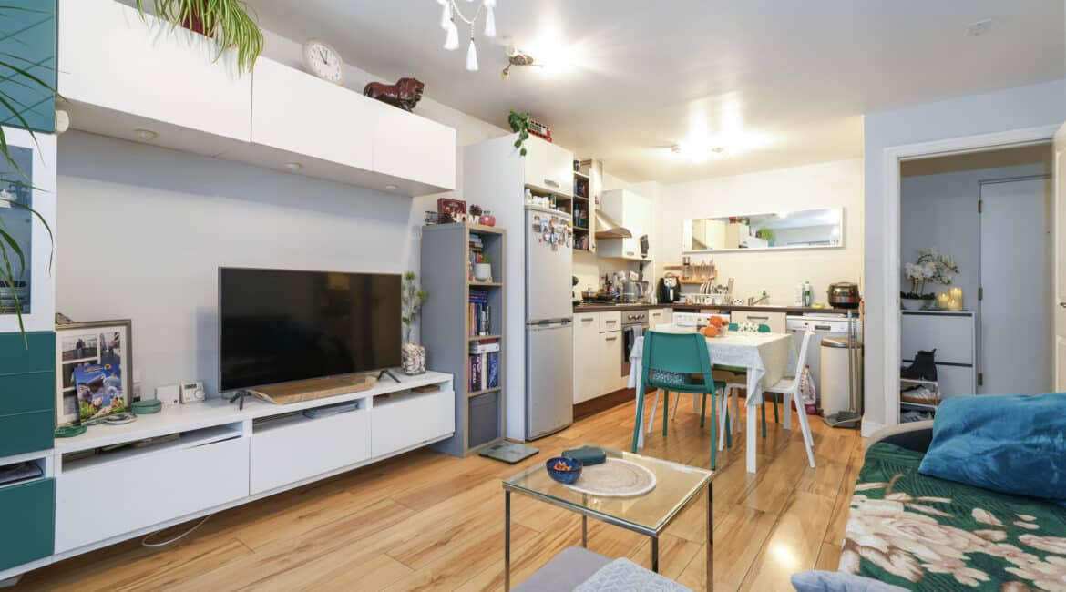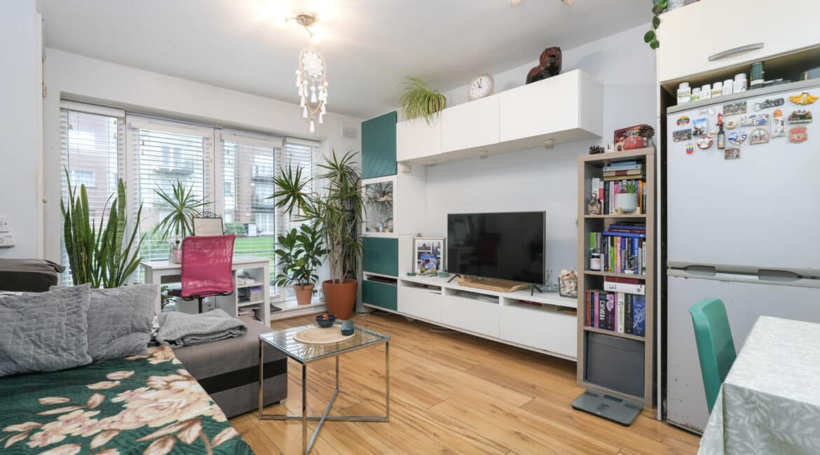 Spanning c. 60 sq.m, the accommodation comprises: entrance hallway, a large open-plan kitchen/living/dining area with access to a private south facing patio, two spacious double bedrooms with built-in wardrobes, a large family bathroom, and a storage closet.