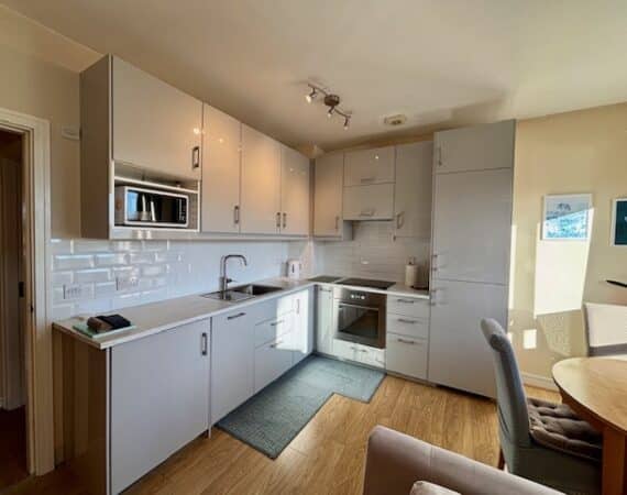 Bright and airy internal living accommodation of entrance hall, open plan kitchen/ dining area with a door to balcony, two bedrooms and a main bathroom. Main bedroom also has Balcony to back of property.