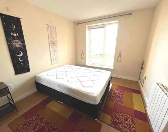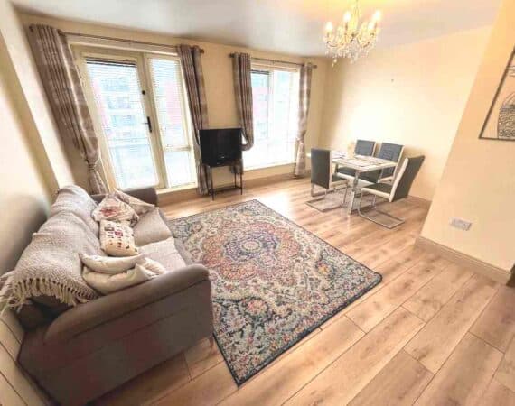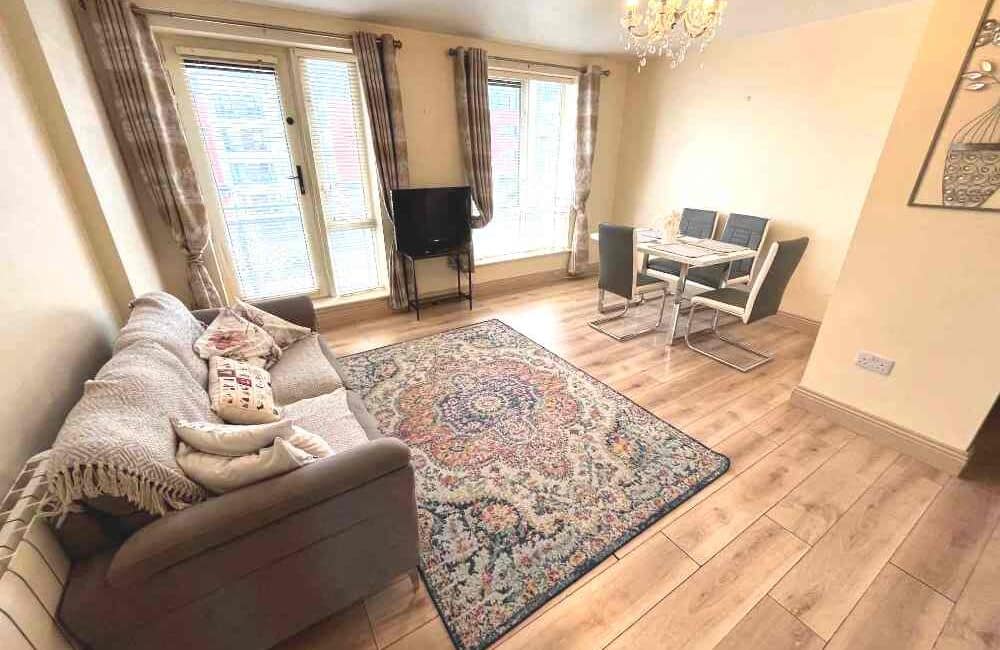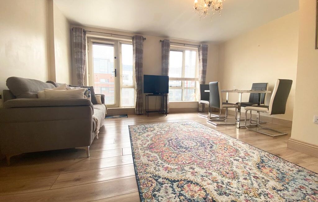 Extra spacious and light-filled living accommodation comprises of entrance hallway two spacious double bedrooms, main bathroom and a large open plan living/dining room with fully fitted kitchen with built in appliances.