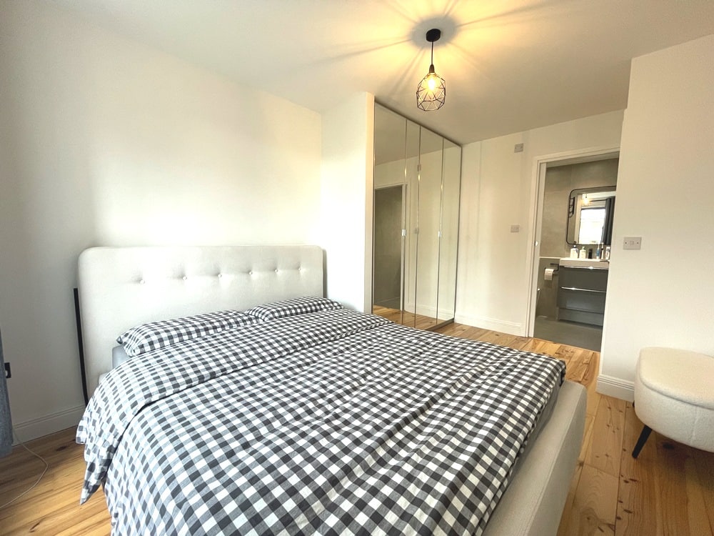 The accommodation comprises an entrance hallway, a bright and comfortable living/dining area, and a fully fitted kitchen with integrated appliances. There are two well-proportioned bedrooms, including a master with ensuite, along with a main bathroom.